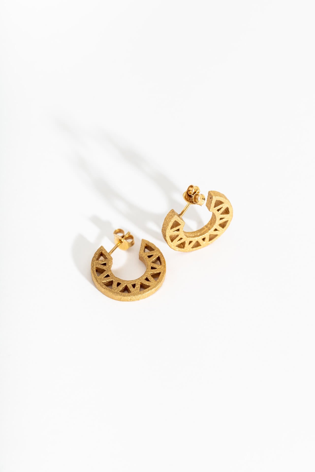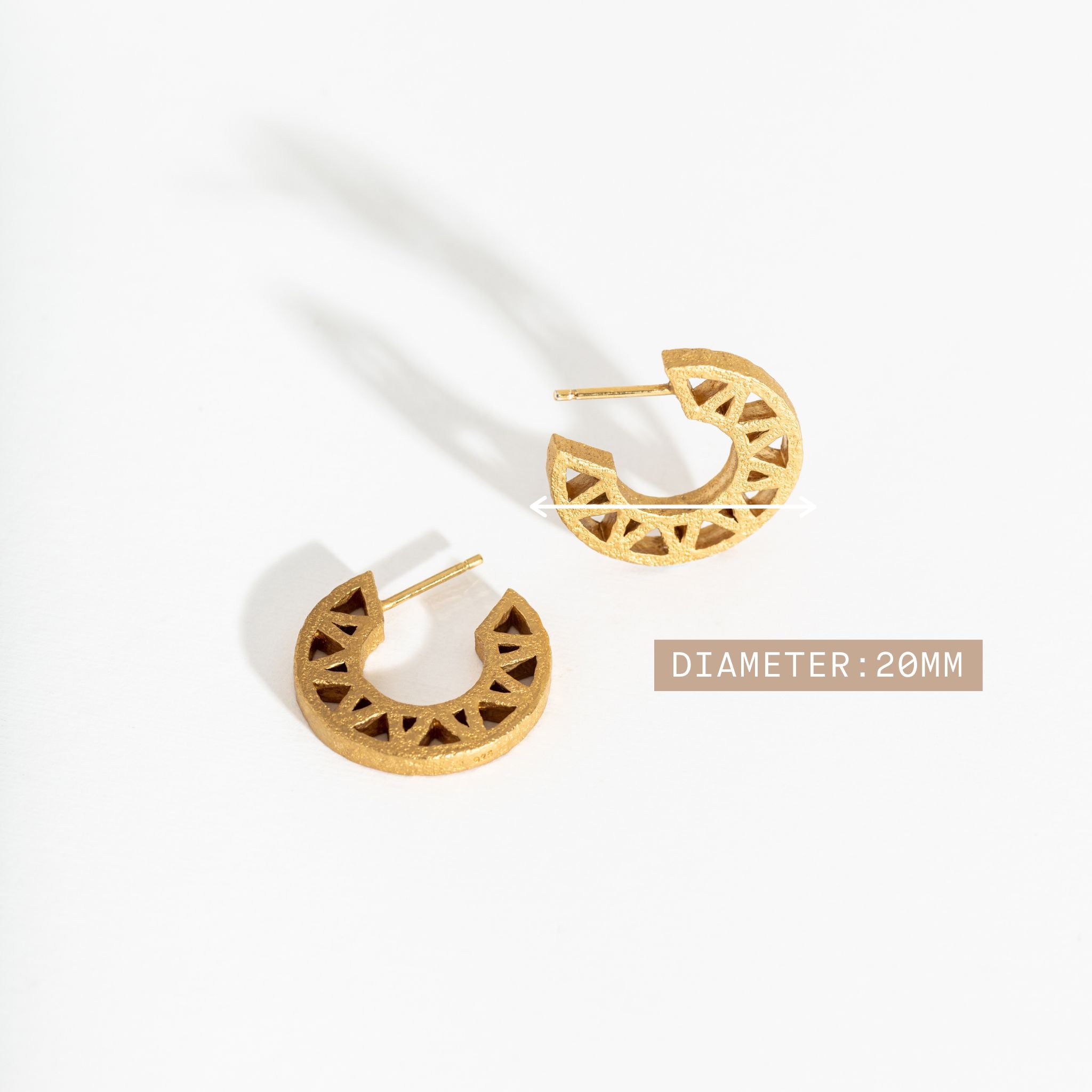 We do hoop earrings better. These solid 14k gold vermeil hoops have a striking geometric pattern which curves inside the 20mm hoop. Surprisingly light to wear the warm gold earrings feature a textured antique finish for a luxurious feel.