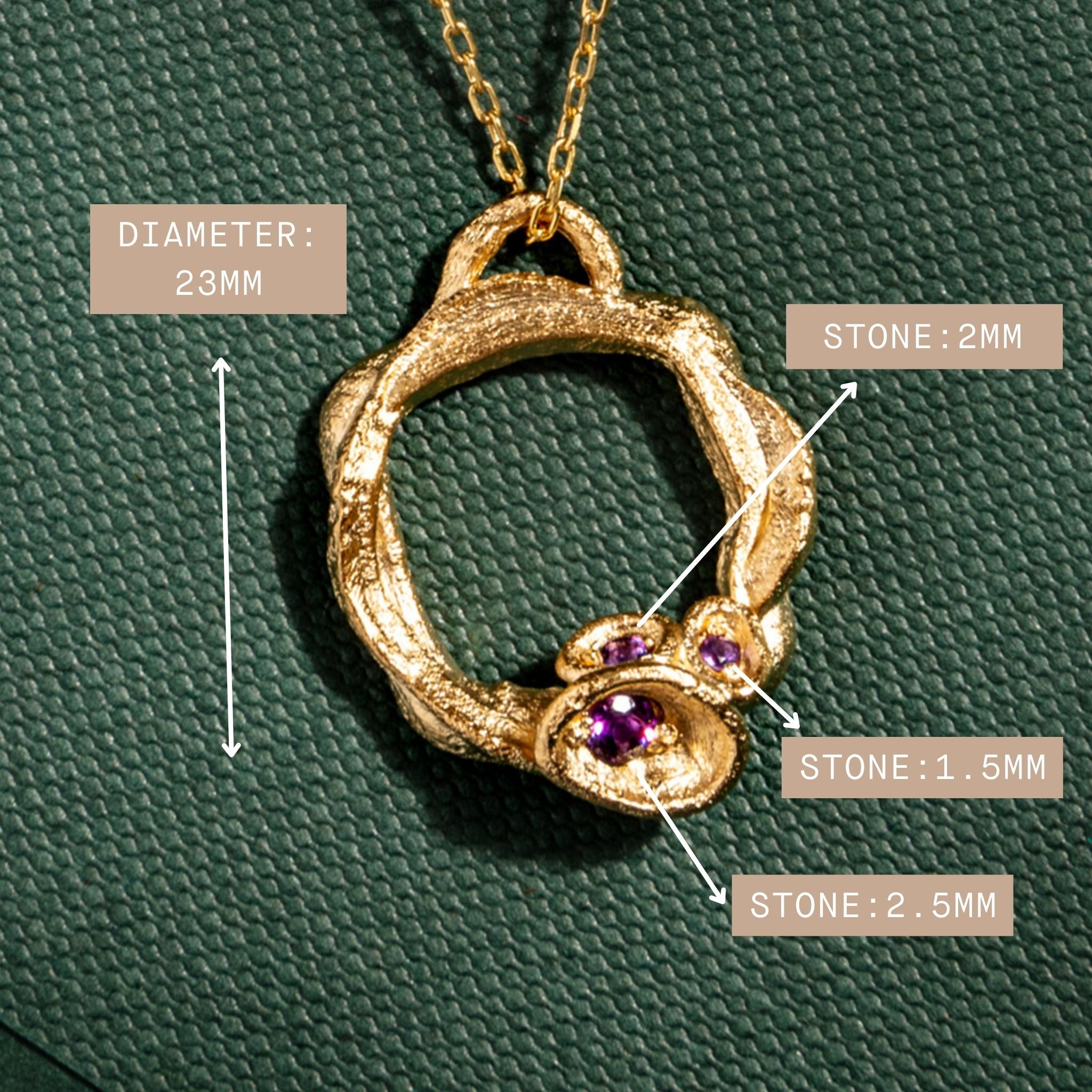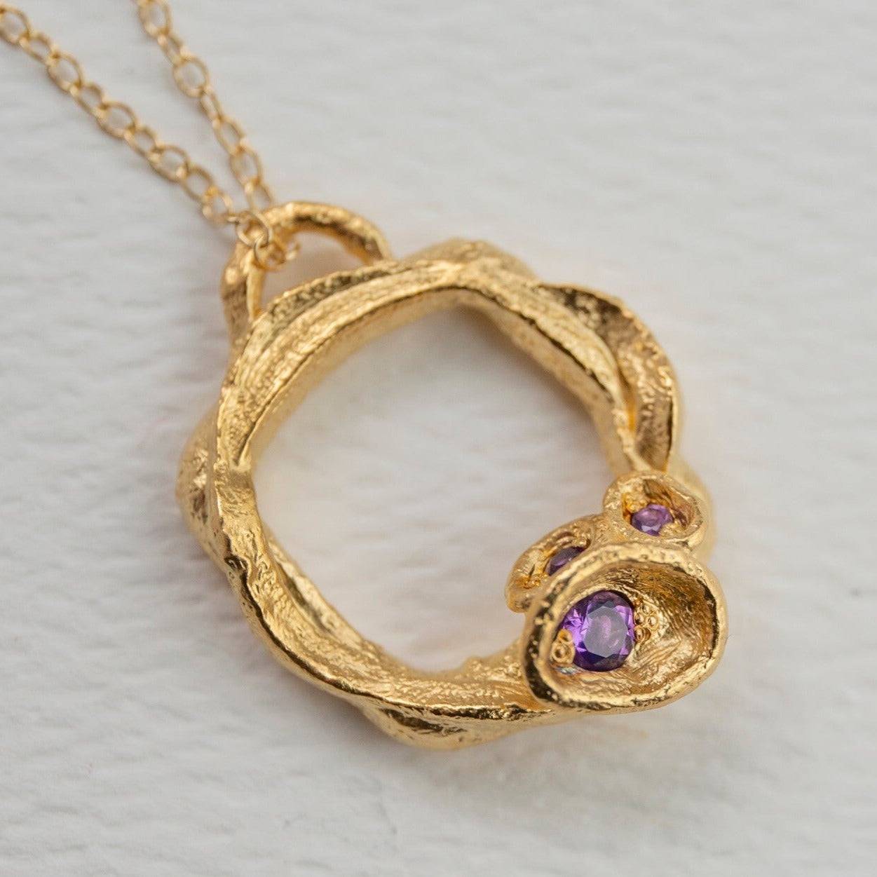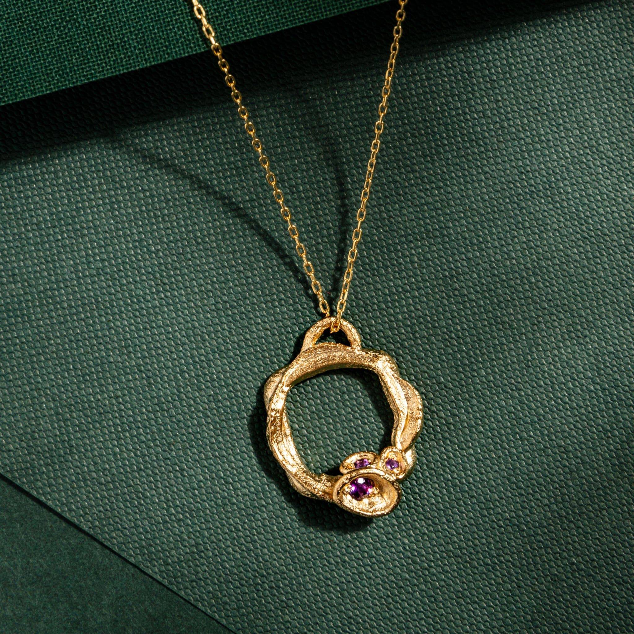 The large tactile, gold vermeil branch pendant has a reassuring premium weight but is designed to accompany you wherever you go. Sitting on top of the branch the small purple gemstones nestle like raindrops in the middle of the raised cup lichen.