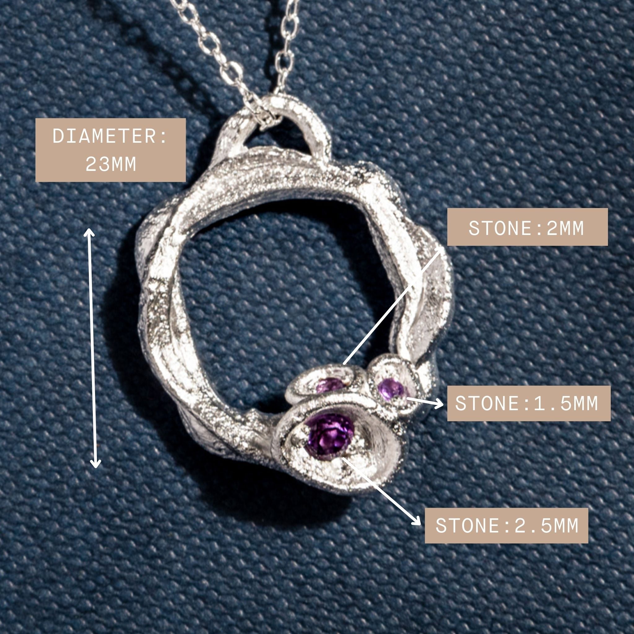 - Pendant with connector: 23mm, Gemstones: 1.5mm, 2mm and 2.5mm