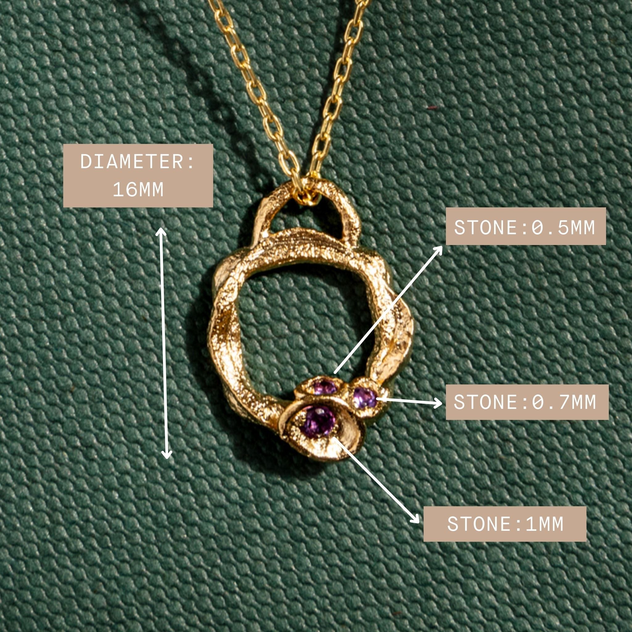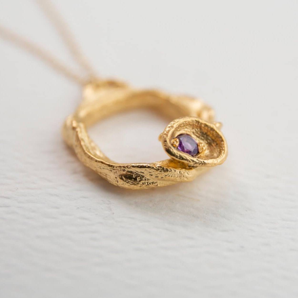 Each of our necklaces is handcrafted and considered with unique attributes. The tactile circle branch and organic lichen are made with a 100% recycled silver base and finished with a thick gold vermeil plating and filled with three ethically sourced amethysts, ready to be worn close to your heart.
