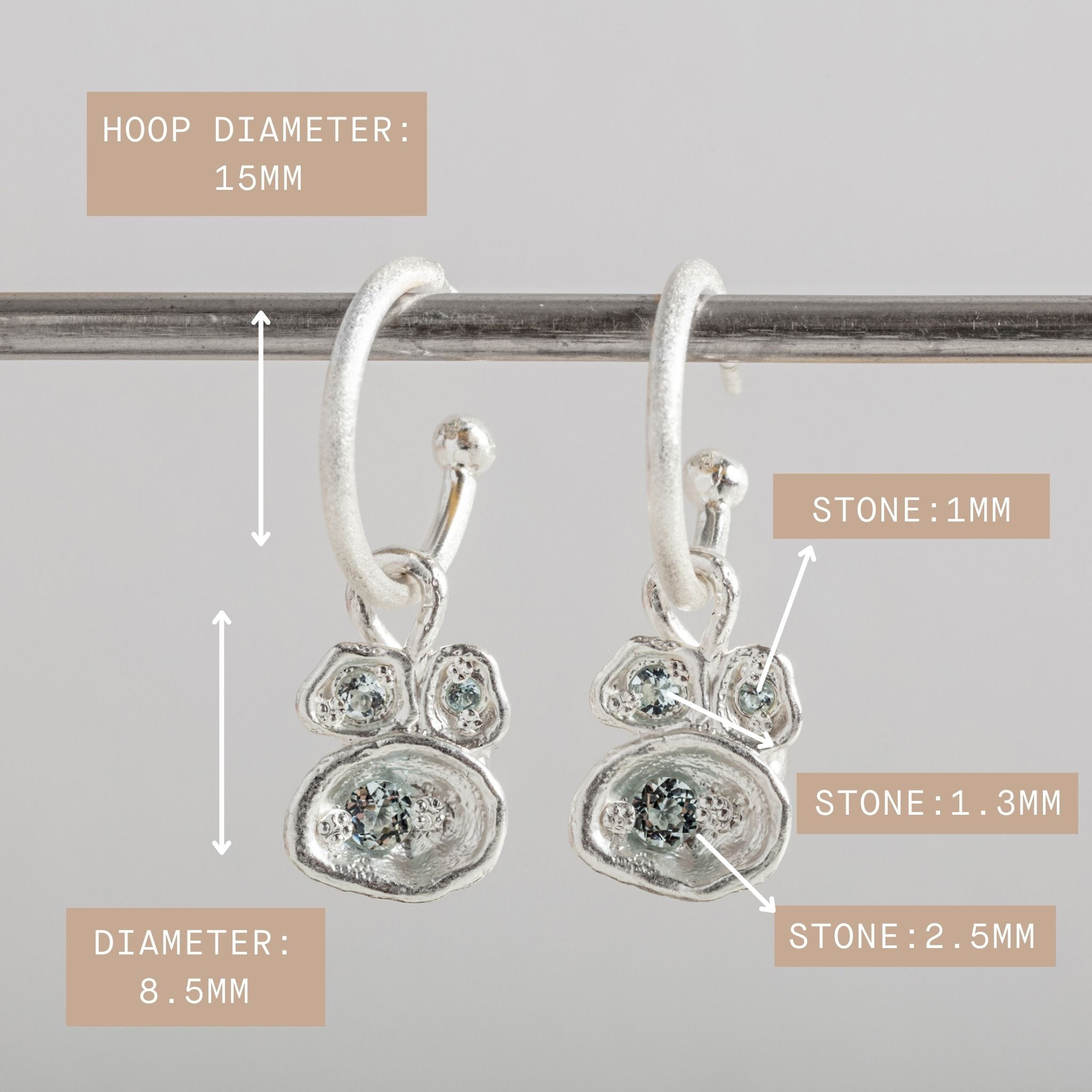 If you are looking for statement studs with a difference these gemstone earrings are the answer. Based on Claire’s designs, every element of this birthstone jewellery holds meaning. The removable charm pendants feature a trio of lichen, found in nature and a symbol of resilience. In each pendant three aquamarine gemstones nestle inside like drops of water.