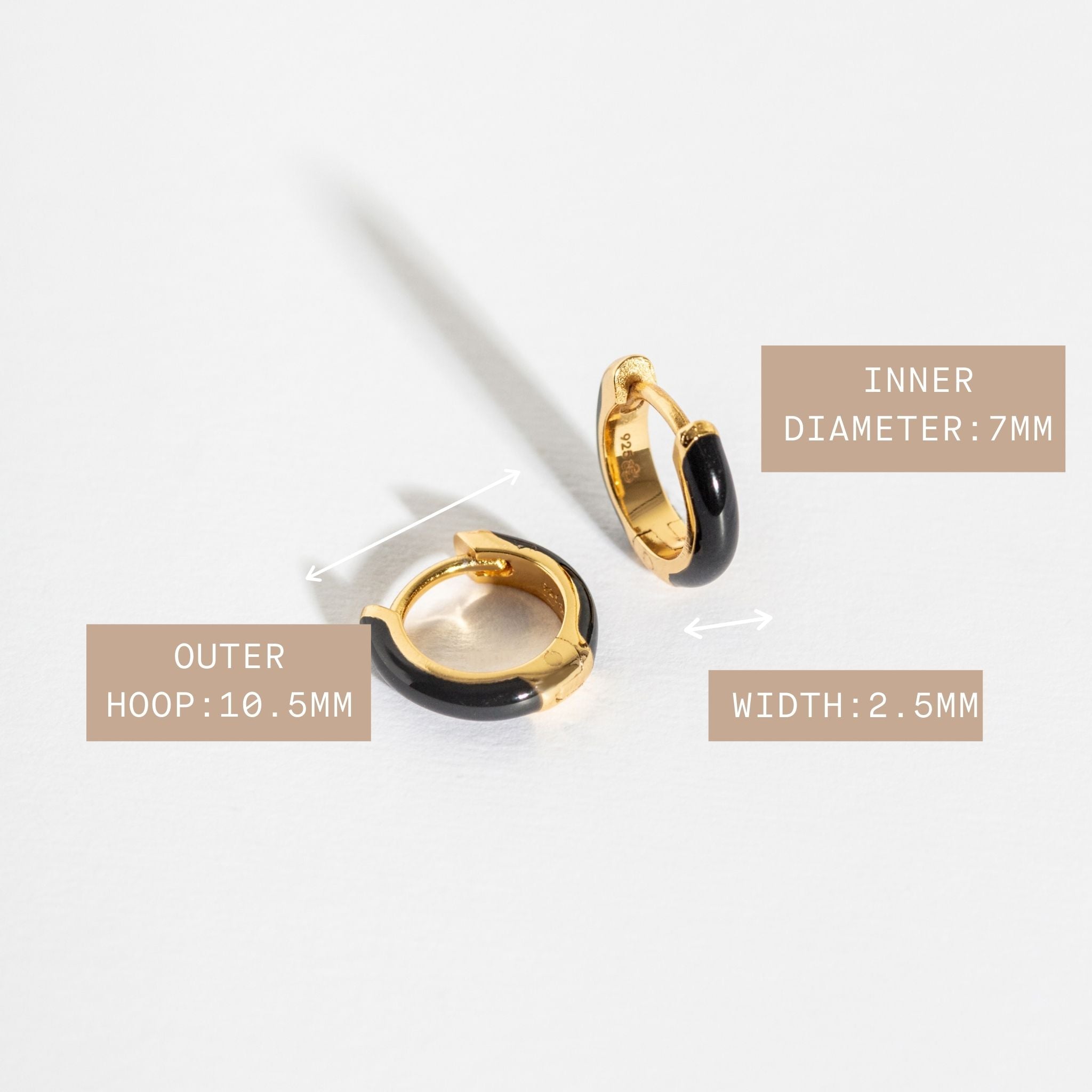Elevate your earring game with these chic black and gold enamel huggie hoops. A modern twist for your earring collection. Get ready for endless compliments.