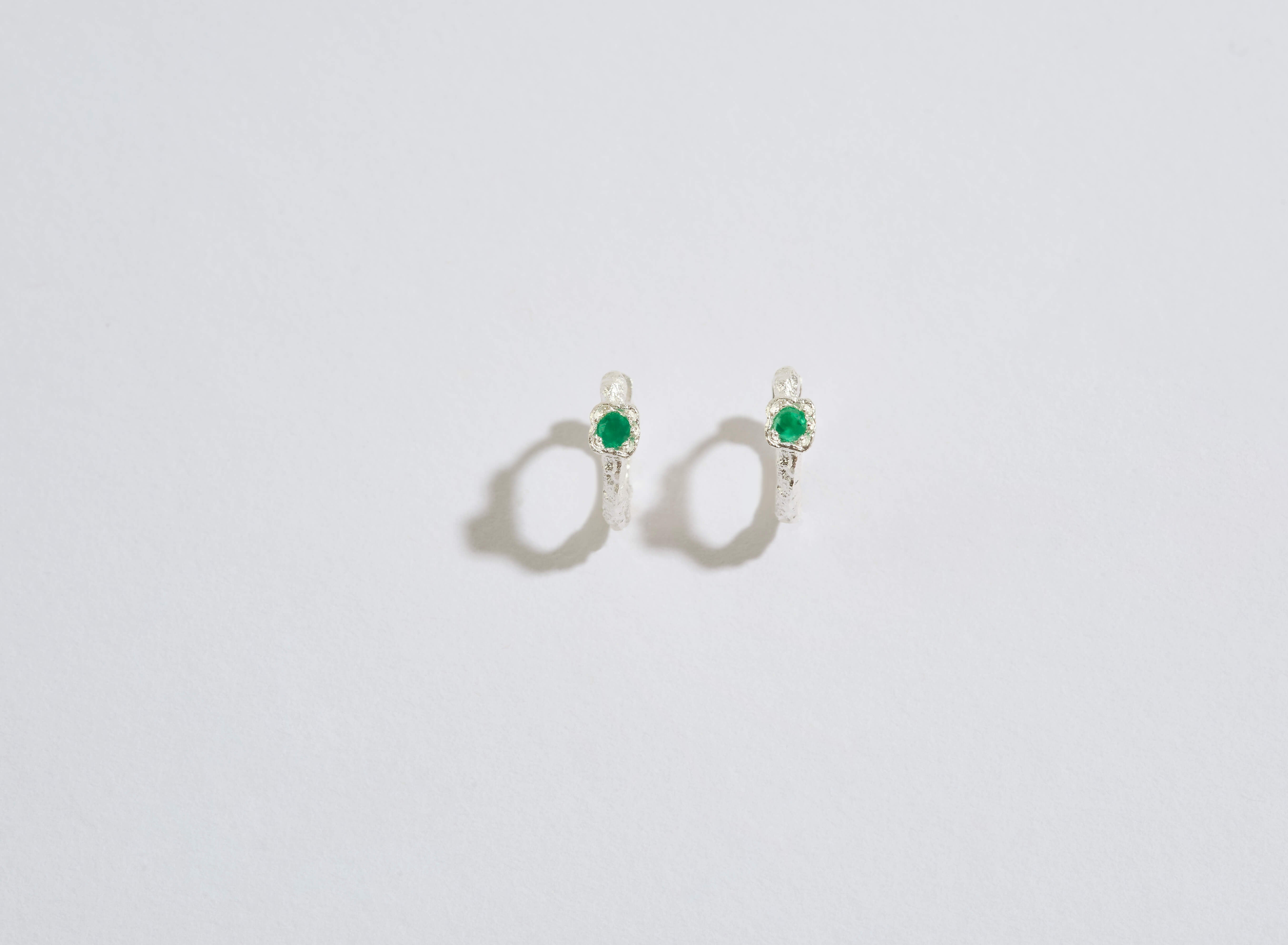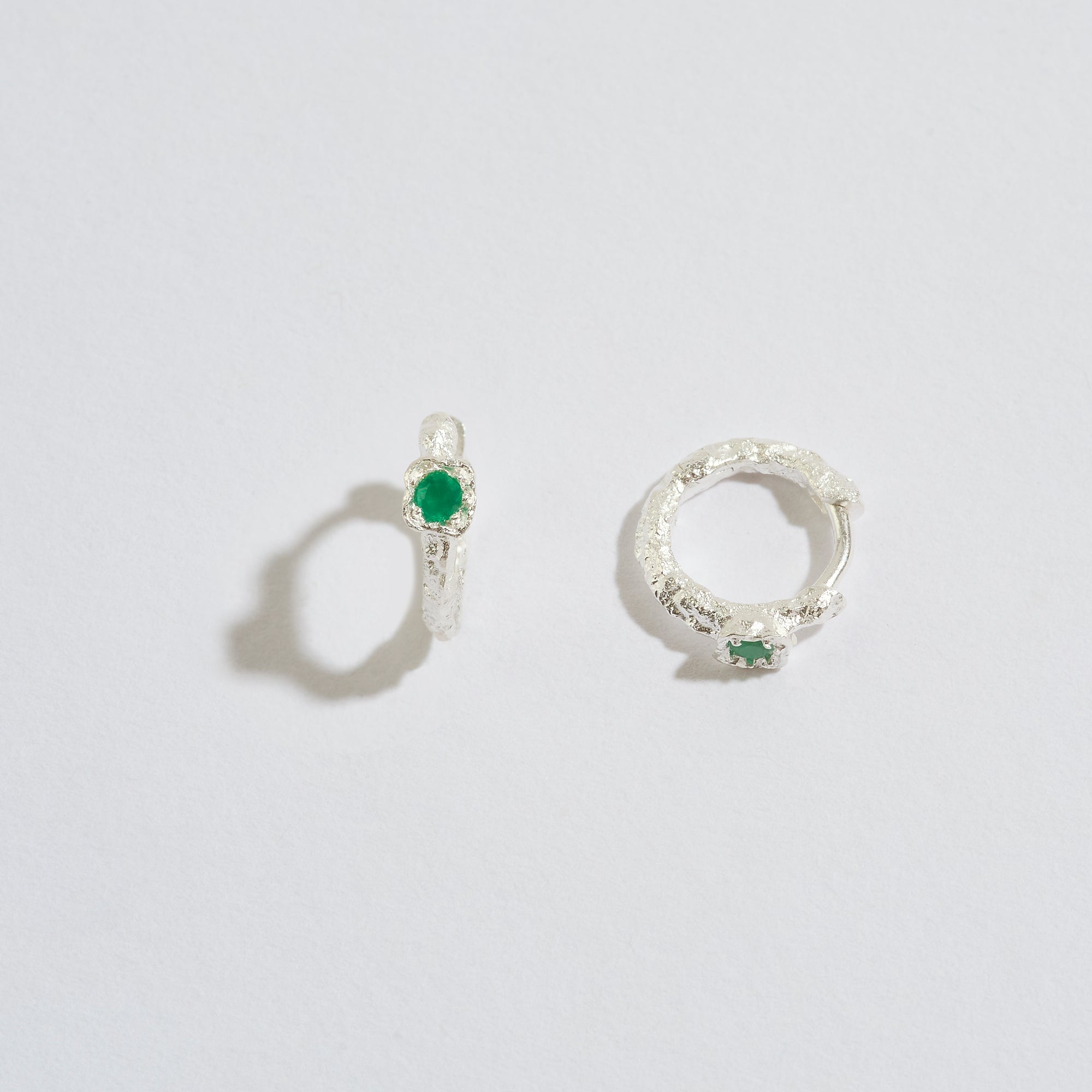 Layer up with these mini huggie hoop earrings. Inspired by the resilience of lichens and finished with a striking green chalcedony gemstone. Effortlessly upgrade your ear stack.