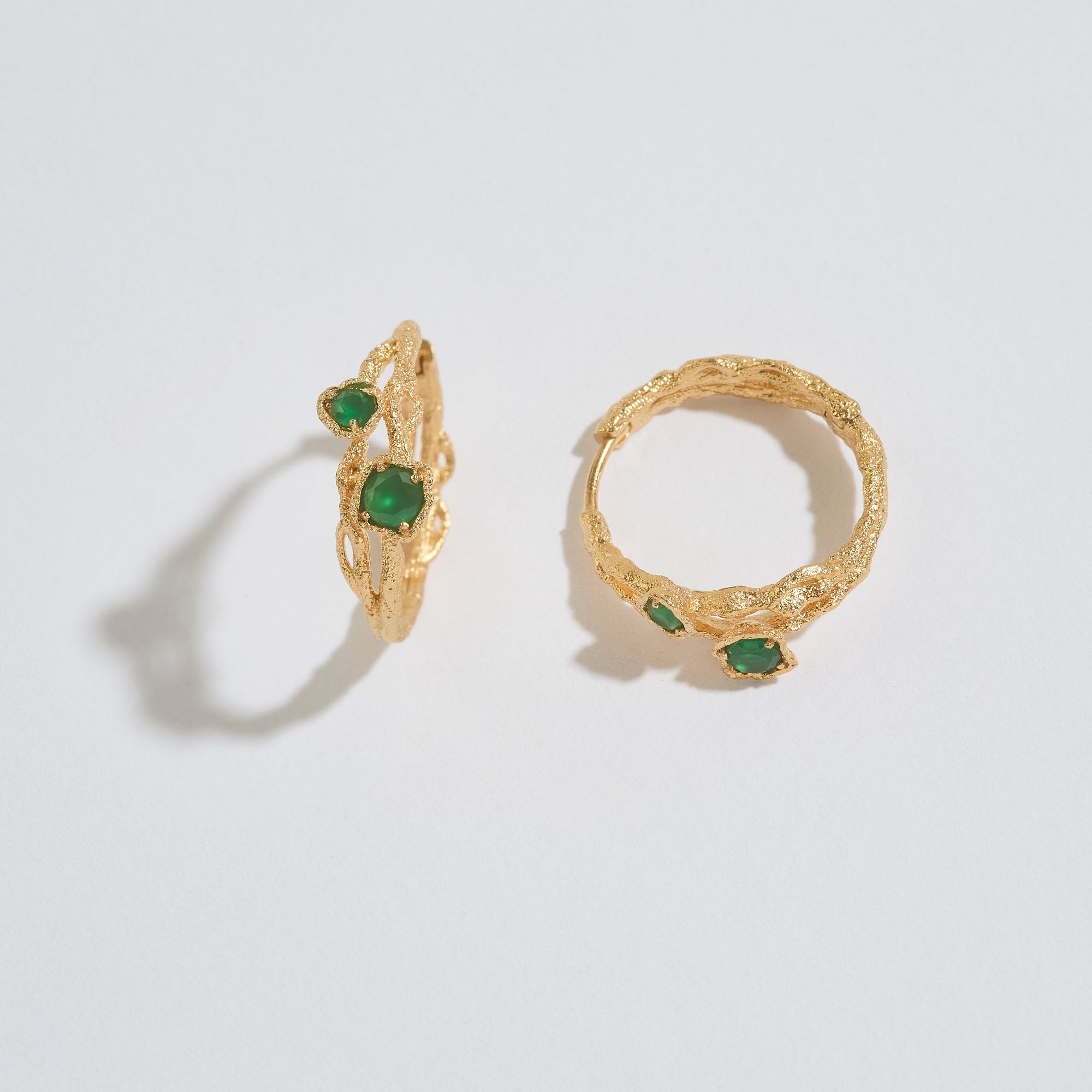 Style meets substance with these twisted branch gemstone hoops. Striking green chalcedony gemstones sit in cup lichens, a symbol of resilience and a reminder to walk your own path.