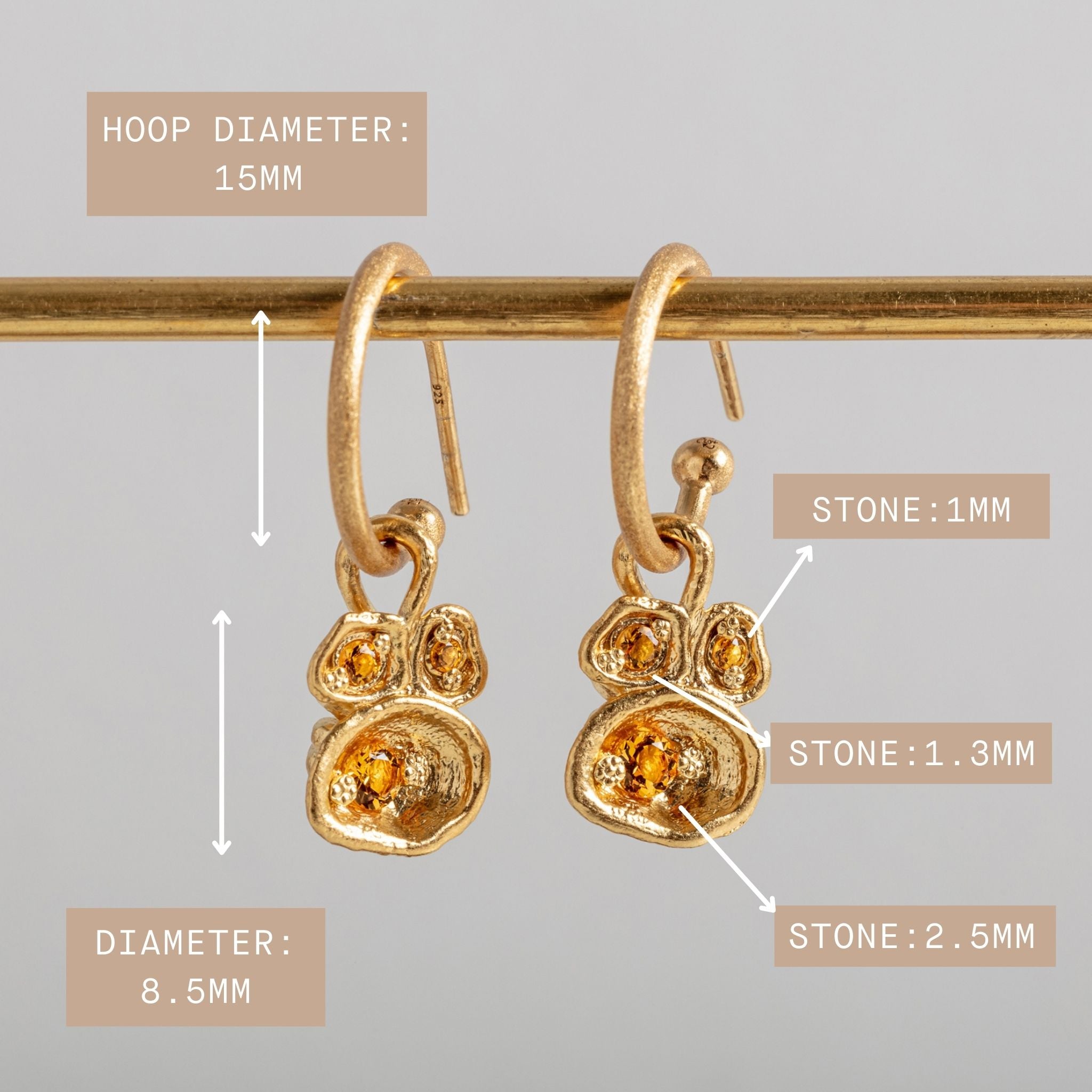 Get dressed for success. Citrine is known as the money stone and with its firey orange glow sent from the sun you will feel expensive and luxurious every time you wear these gemstone hoop earrings. Ethically made to wear on repeat where will you wear these gold hoops?