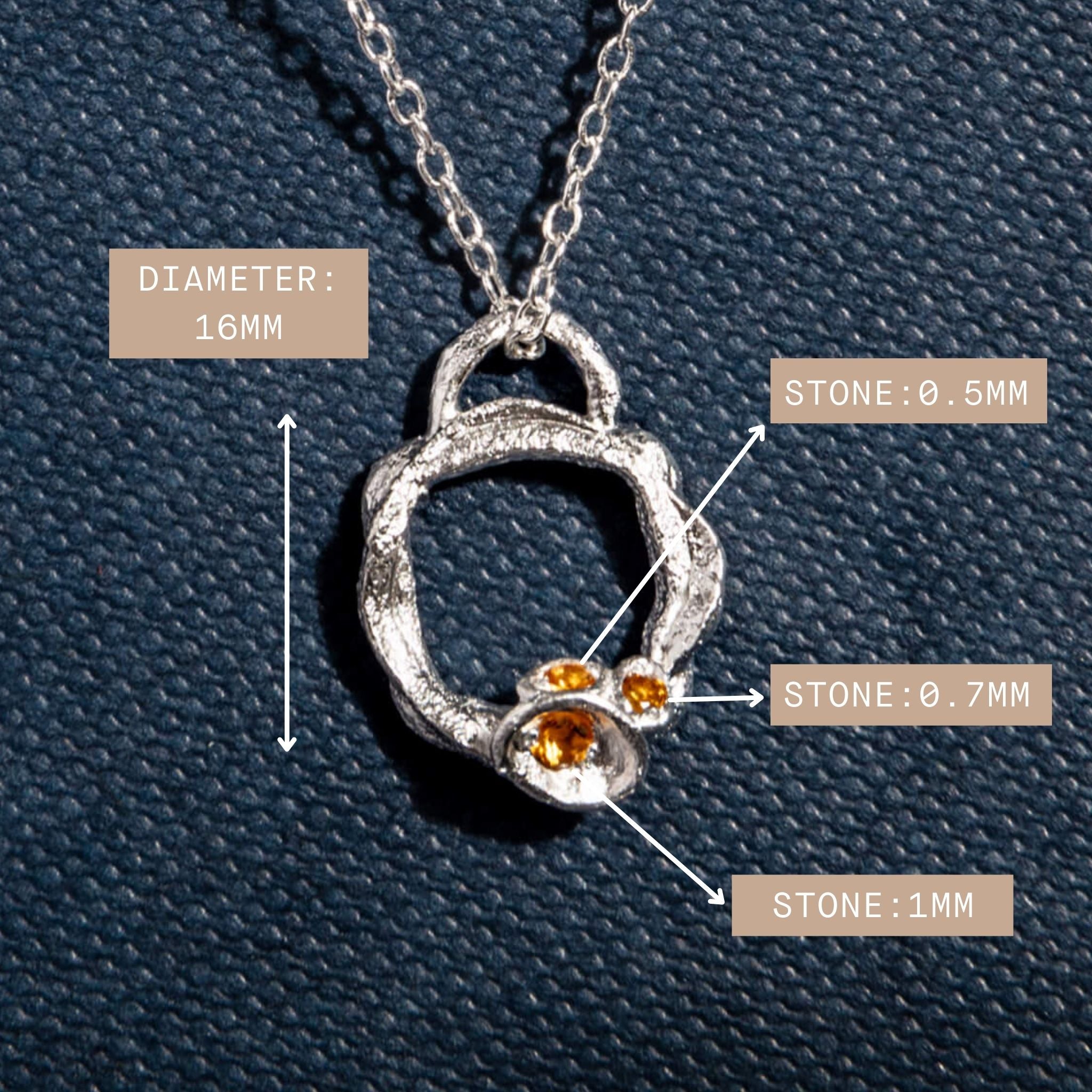 Each of our necklaces is handcrafted and considered with unique attributes. The tactile circle branch and organic lichen are made with a 100% recycled silver base, symbolising eternity and resilience and the three ethically sourced citrine stones are used for motivation.