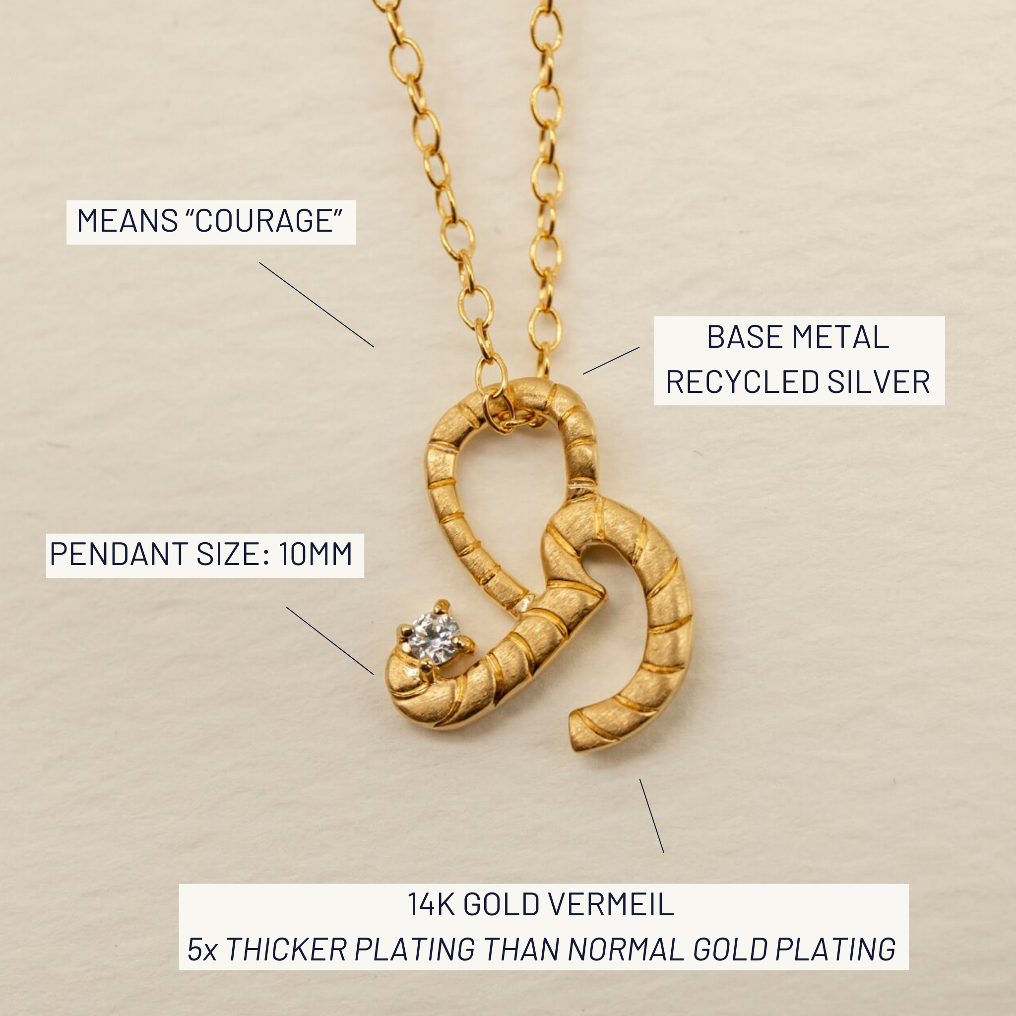 Brought to life in a stunning twisted rope style, this Courage charm features a cubic zirconia and is finished in 14k gold vermeil plating, making it a durable but elegant everyday option.