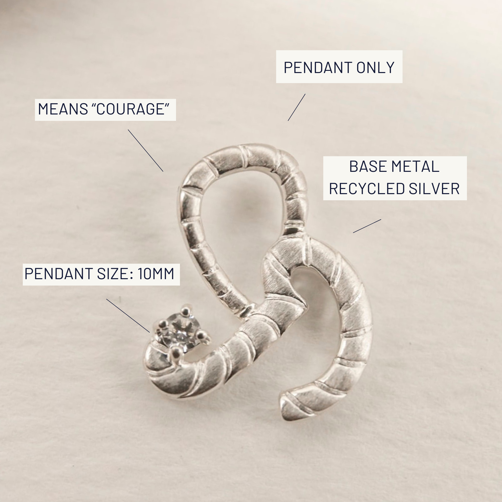 Let our jewellery be the armour you wear to face the world, while looking great of course. This Shorthand silver charm pendant meaning 'Courage' is one you can reach for on those days you need some inner strength. Add it to your favourite necklace, and head out into the world.