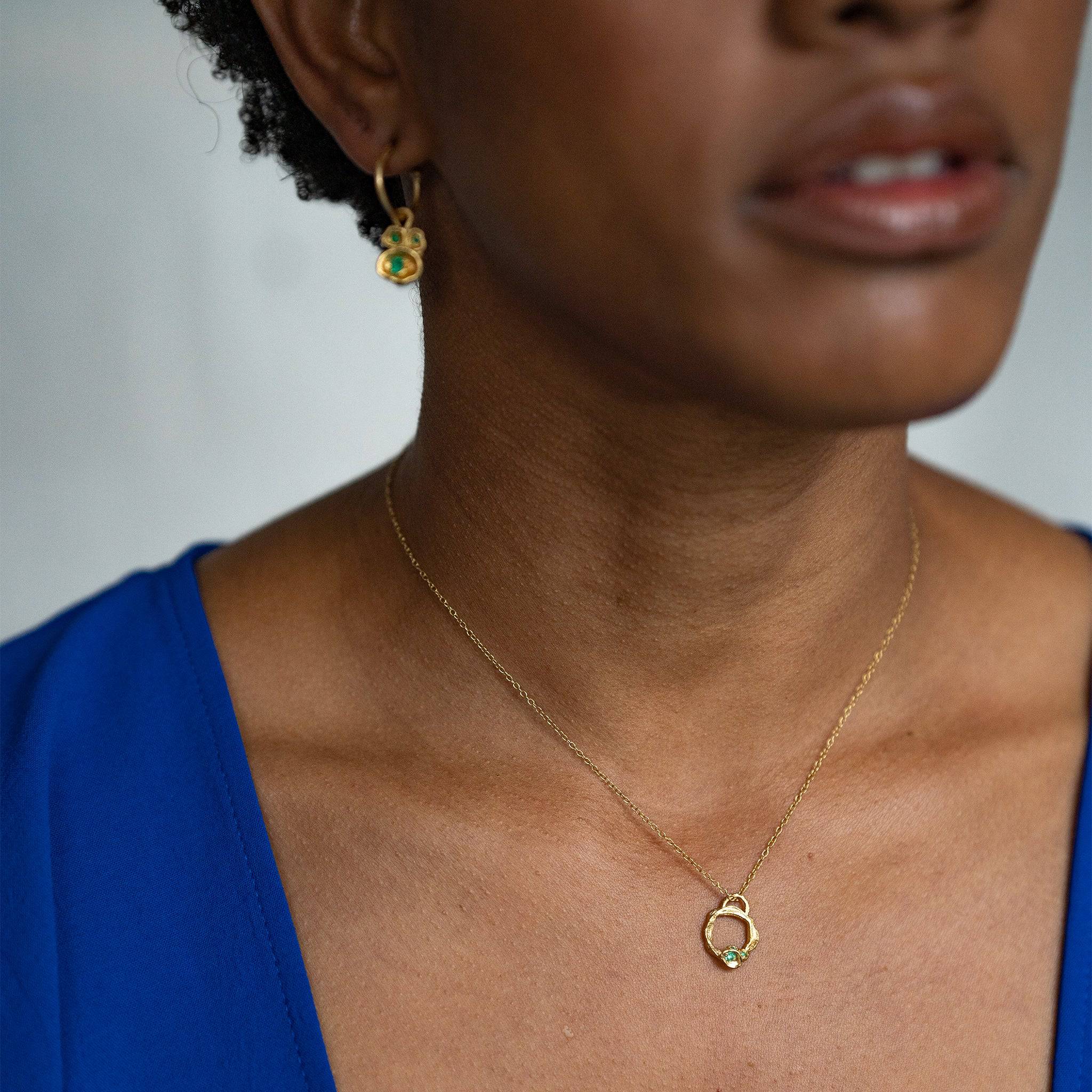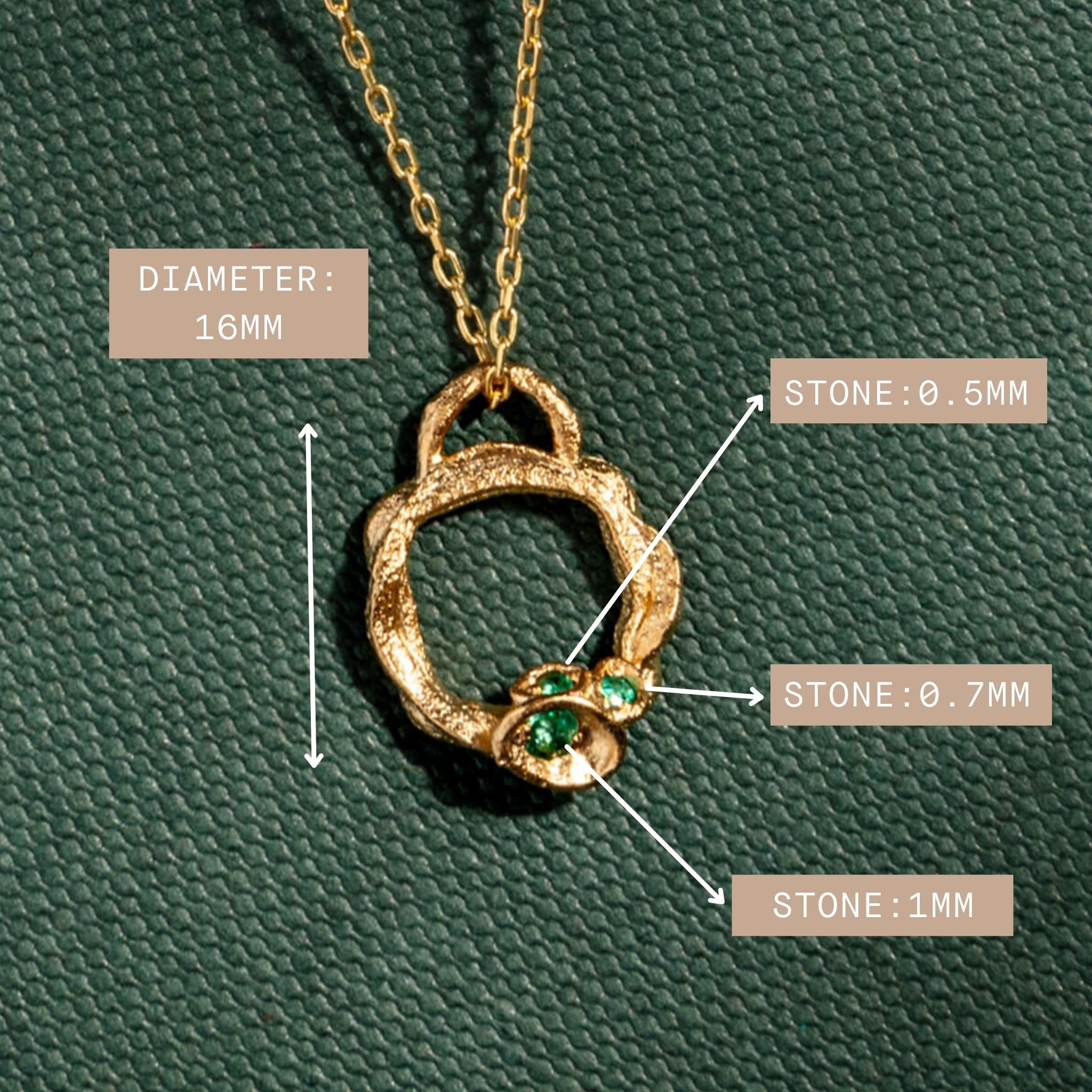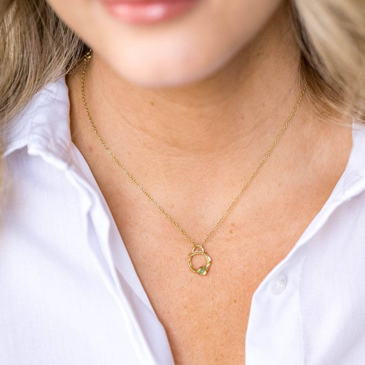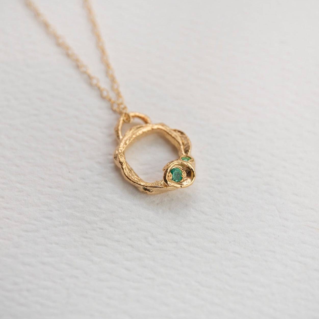 Invest in demi-fine, consciously-made timeless jewellery that is personal to you with this stunning emerald and gold vermeil necklace. Set on a branch circle and nestled in stunning cup lichen, the deep emerald stone grounds us with the natural world. Symbolising a new beginning, loyalty, and peace, the birthstone of May, is the finishing touch to a luxurious dainty necklace to be cherished.