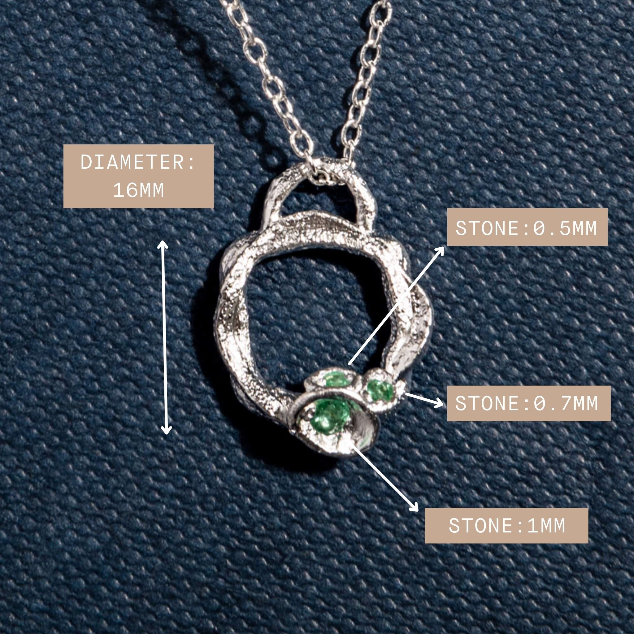 Expertly handcrafted from an original design by Claire, every element of this stunning dainty pendant has extra symbolism. The circle branch stands for eternity, the lichen represent resilience and the emeralds symbolise loyalty and new beginnings.