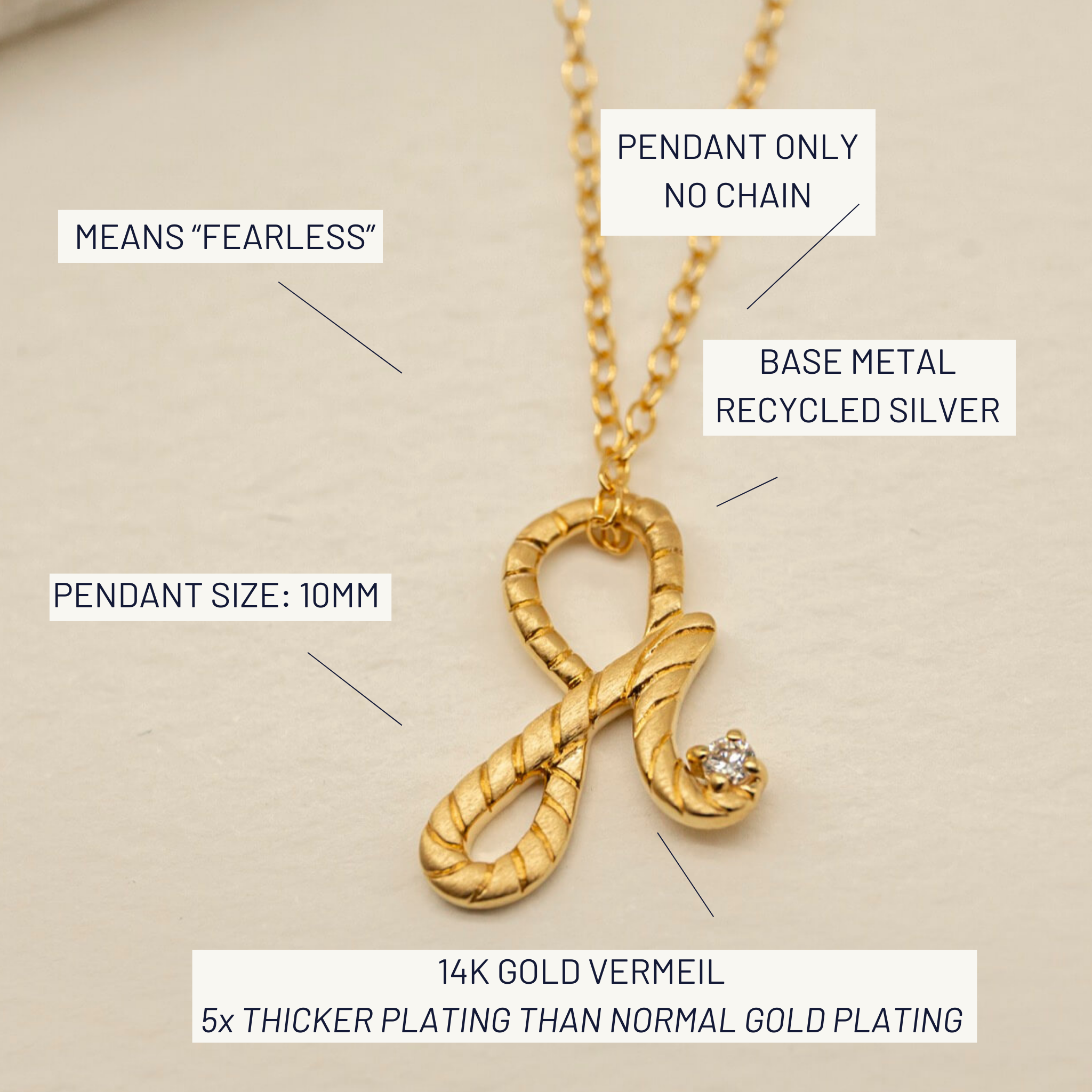 The Shorthand symbol for Fearless is here imagined in twisted rope detail, finished in 14k gold vermeil plating and featuring a cubic zirconia to really help you shine.
