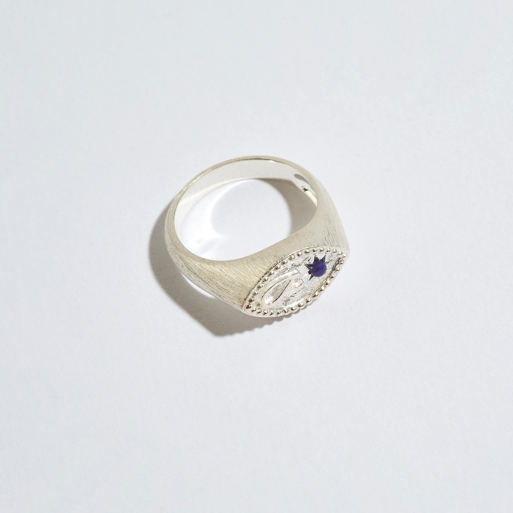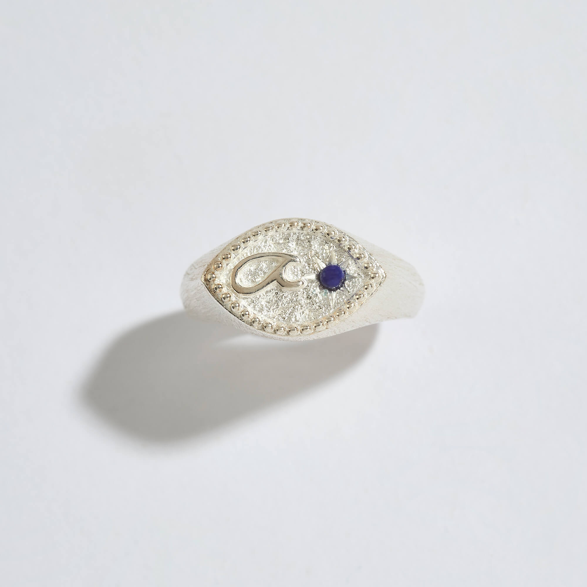 We’ve taken the traditional men’s signet ring and reimagined it with modern edge - featuring an evil eye-inspired shape for protection, a raised ‘Fuck’ Shorthand symbol, and a North Star inset with an ethically sourced lapis lazuli gemstone.