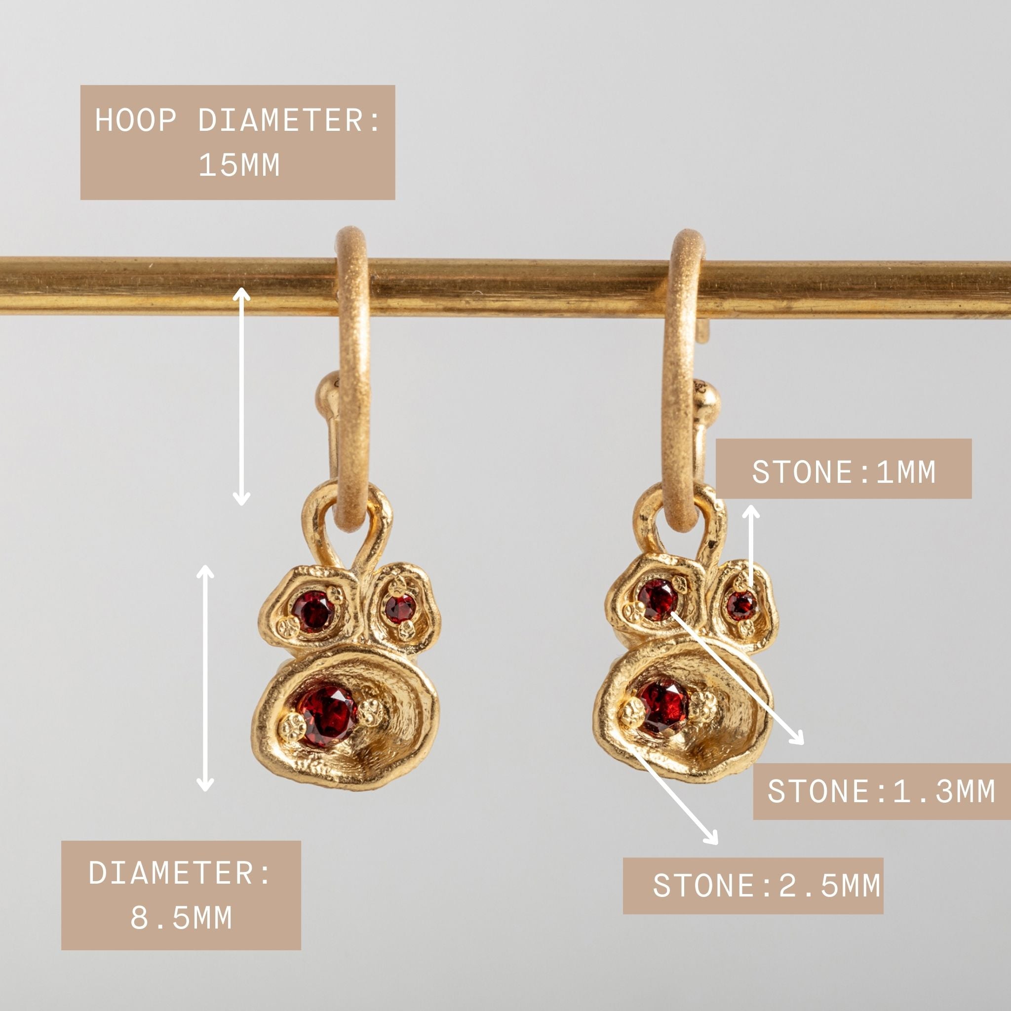 Get dressed for success. Make an impact with these unique garnet gemstone hoop earrings. The nature-inspired organic pendants are filled with three semi-precious deep red gemstones, which add a luxurious effect to the warm yellow gold vermeil. Set on a paired back brushed hoop these removable charms are unique hoops for daily wear.