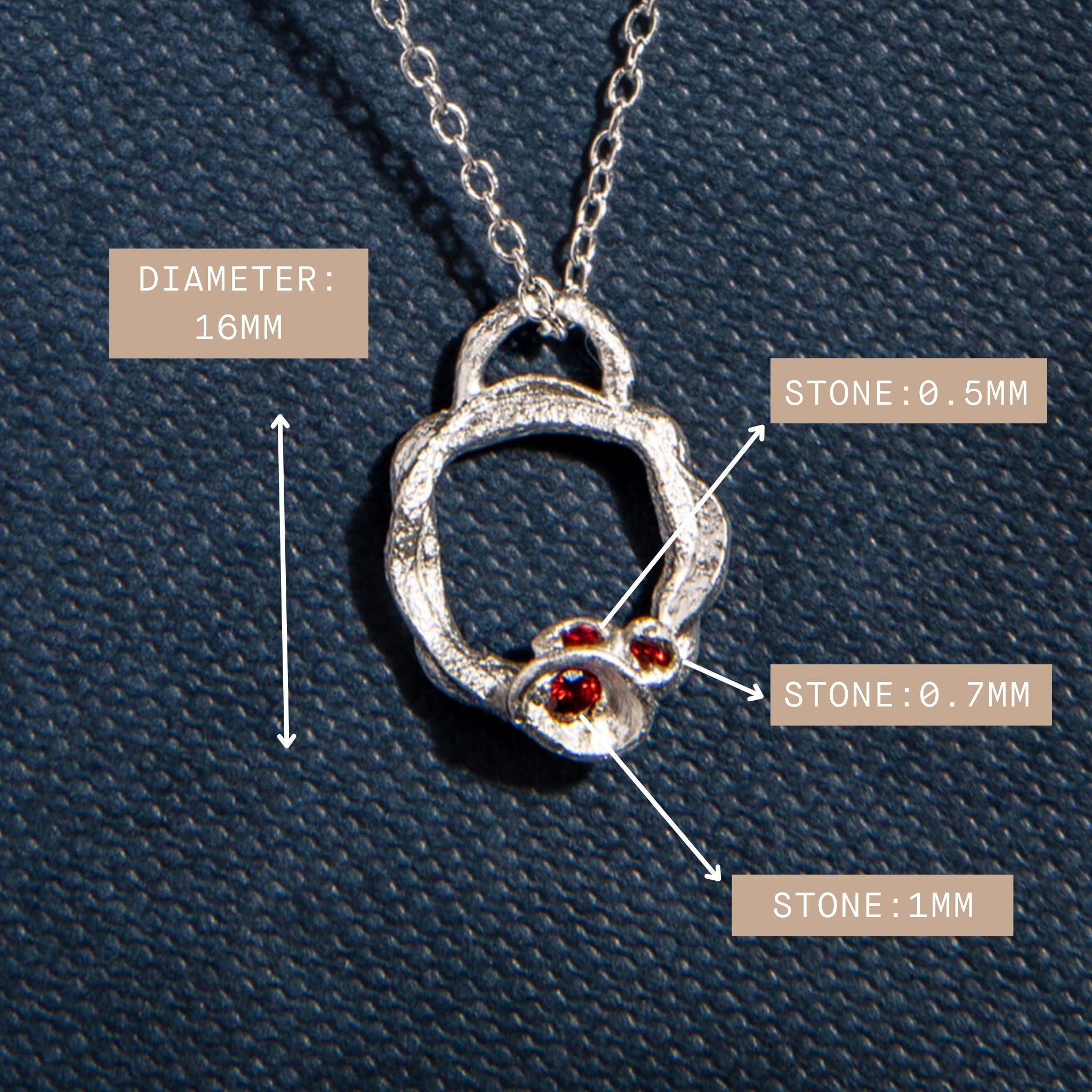 Inspired by nature every element of this unique small silver necklace has been designed with meaning and symbolism. The circle of the branch pendant represents eternity, the raised lichen resilience and the three garnet gemstones symbolise success and prosperity.