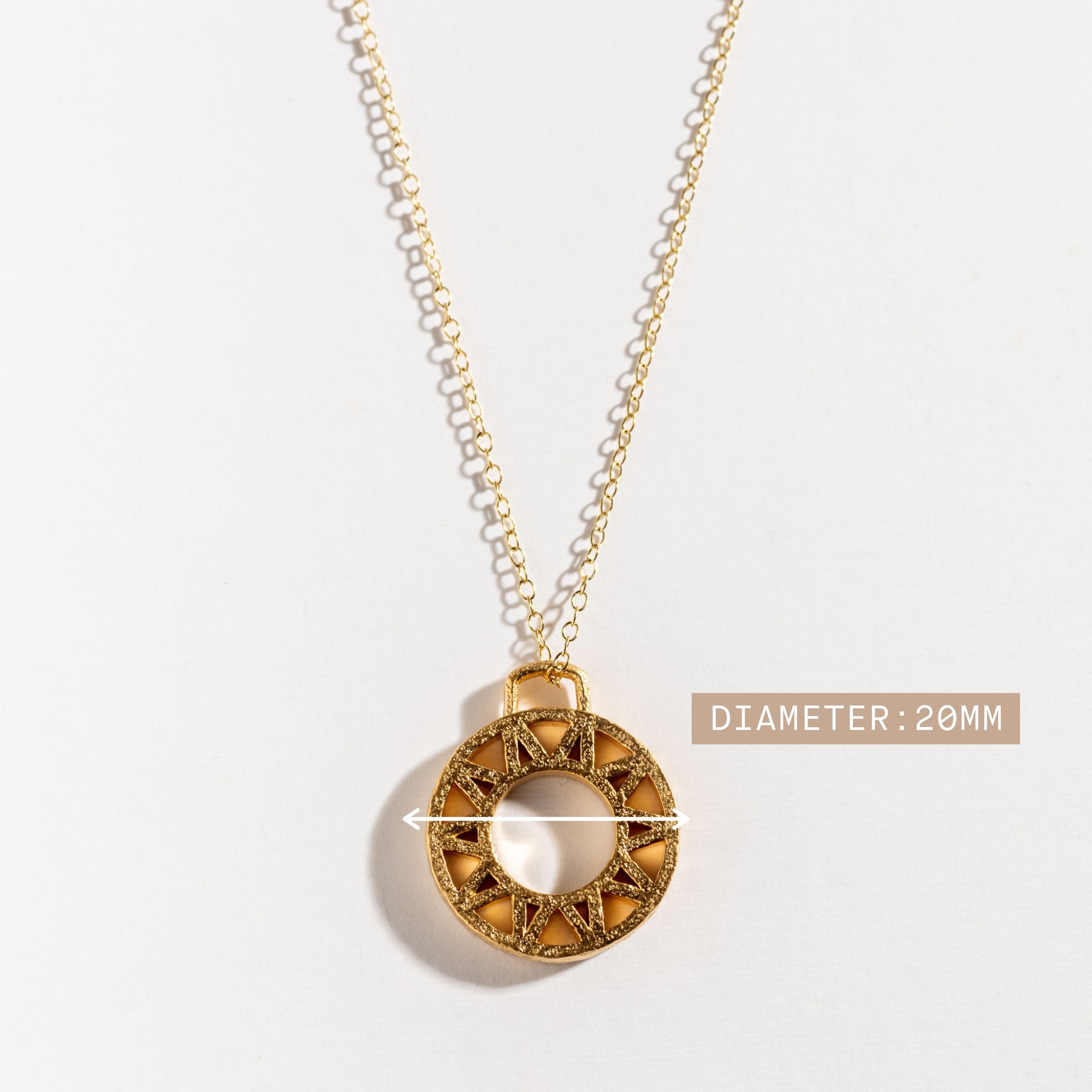 This dramatic disc pendant necklace has an intricate pattern of triangles and a textured finish to enhance the premium feel.