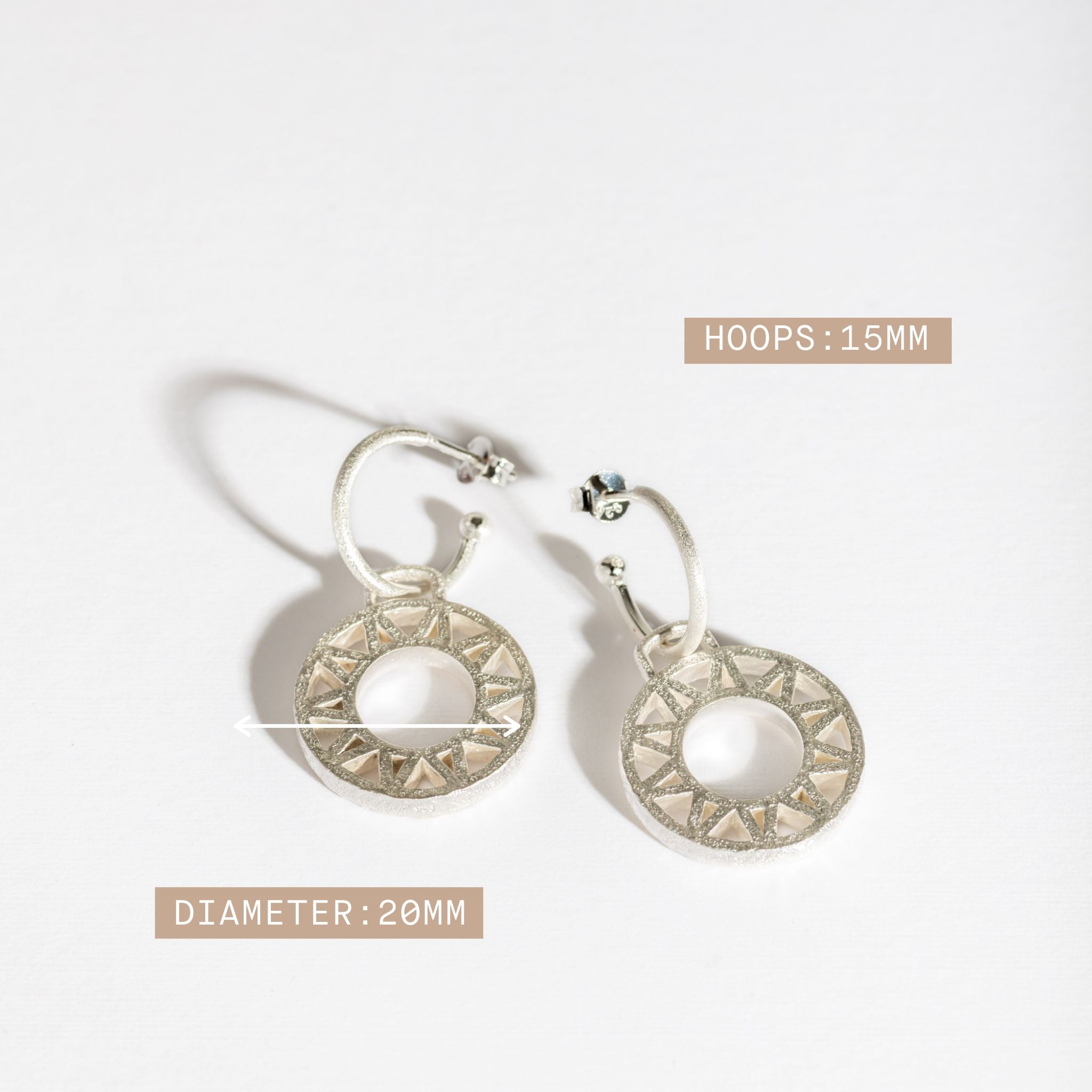 These large, but wearable 20mm pendants, hang on a brushed silver 15mm pair of simple hoops. Effortlessly adding some polish and glamour to your wardrobe.