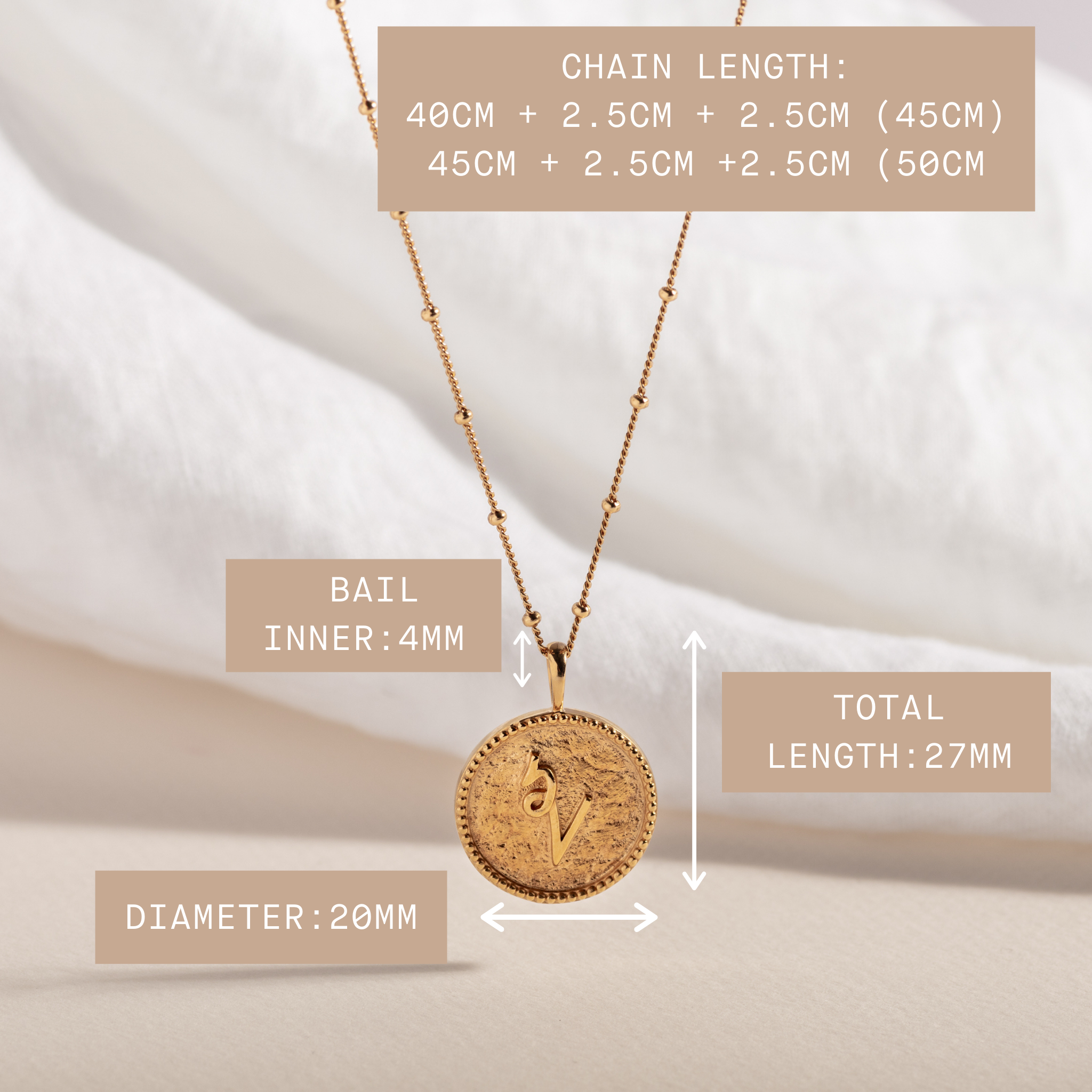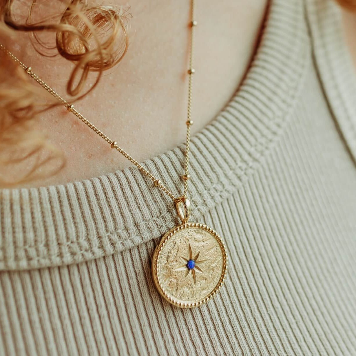 The textured coin necklace has a vintage, antique feel and is reversible for maximum versatility. One side has the Inspire symbol in the centre, the other a North Star with a lapis lazuli gemstone.
