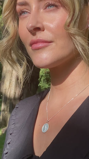 The textured coin necklace has a vintage, antique feel and is reversible for maximum versatility. One side has the Inspire symbol in the centre, the other a North Star with a lapis lazuli gemstone.