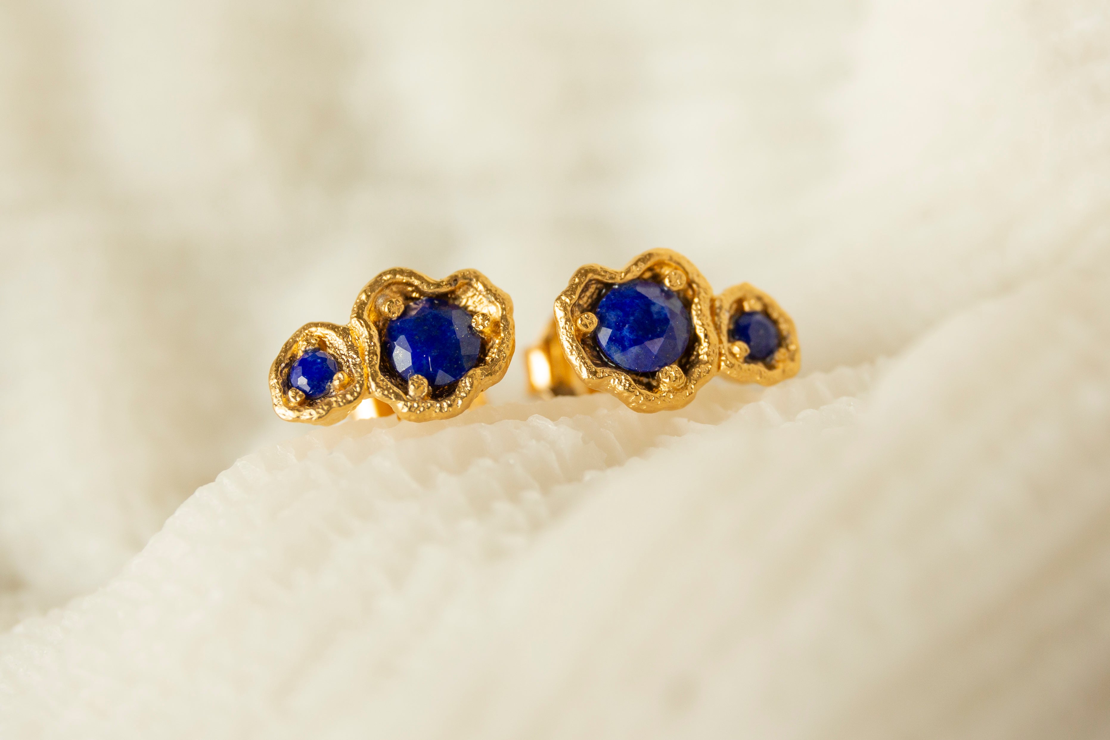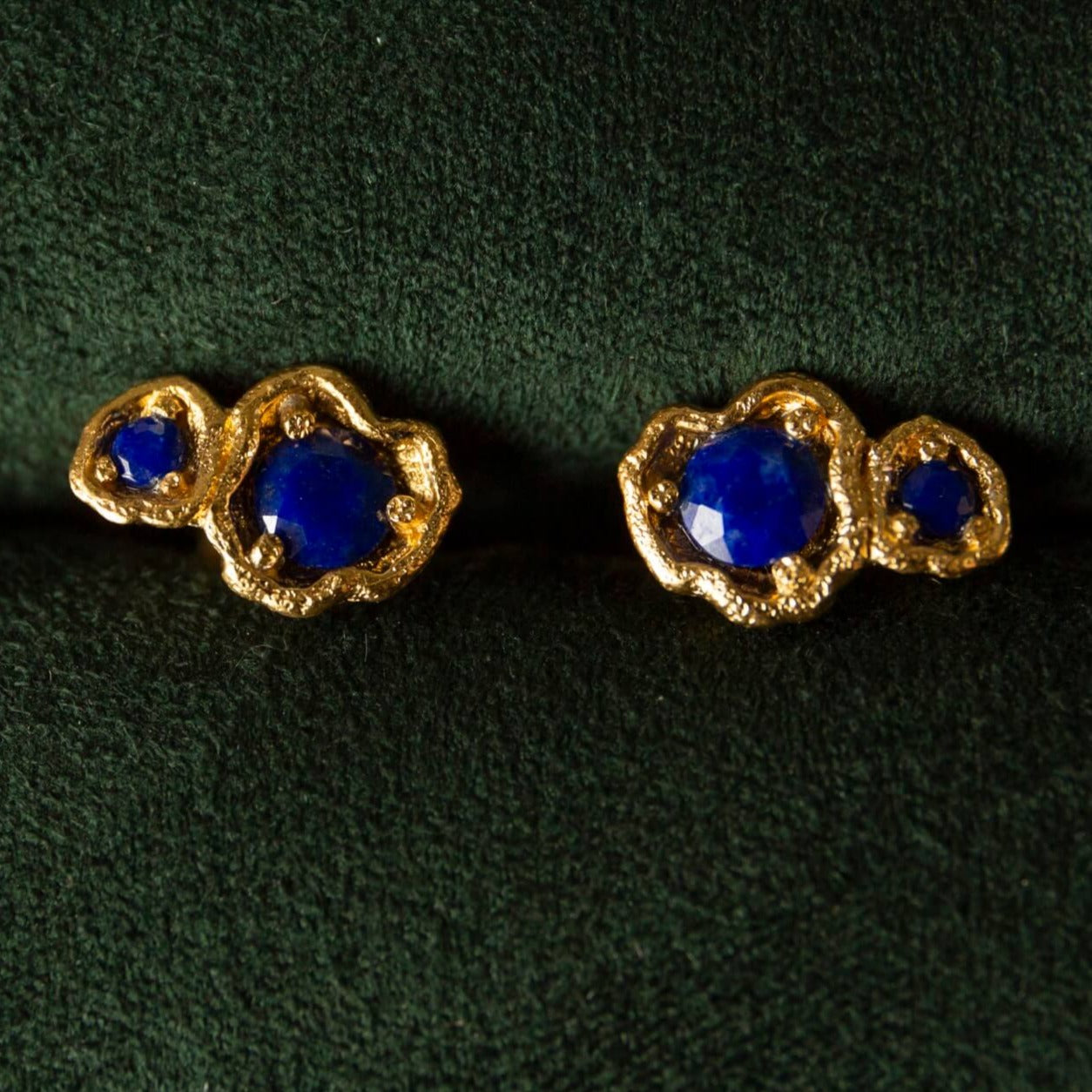 Designed by Claire these earrings are based on lichen found in woodlands to create an organic duo of cups filled with dramatic deep blue lapis lazuli.