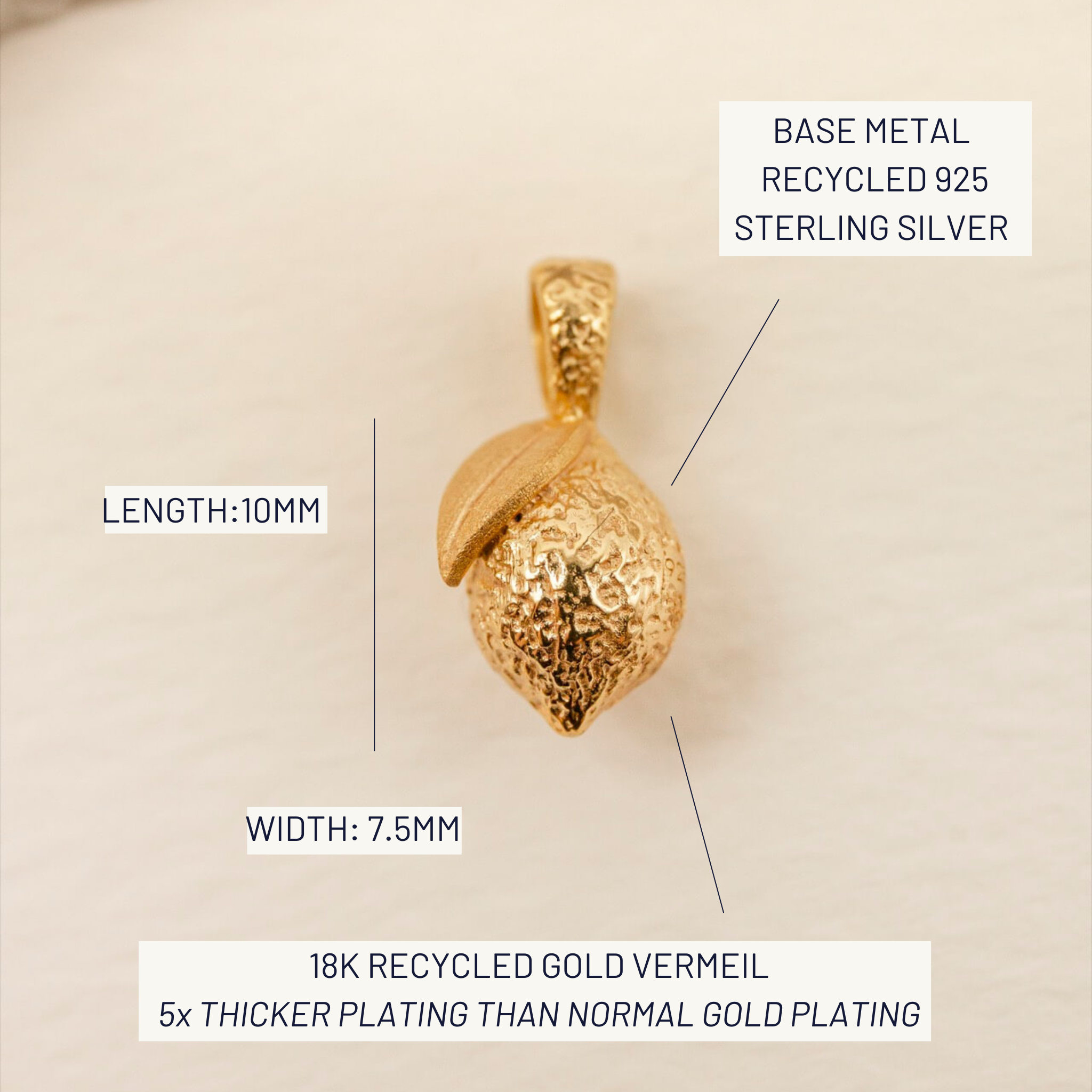 Freshen up your look with our gold lemon charm pendant. Handcrafted in textured 18k recycled gold vermeil this will bring a burst of energy to every look. Add it to your favourite chain or pair with our Rolo Heart Necklace for a charm with a luxurious twist.