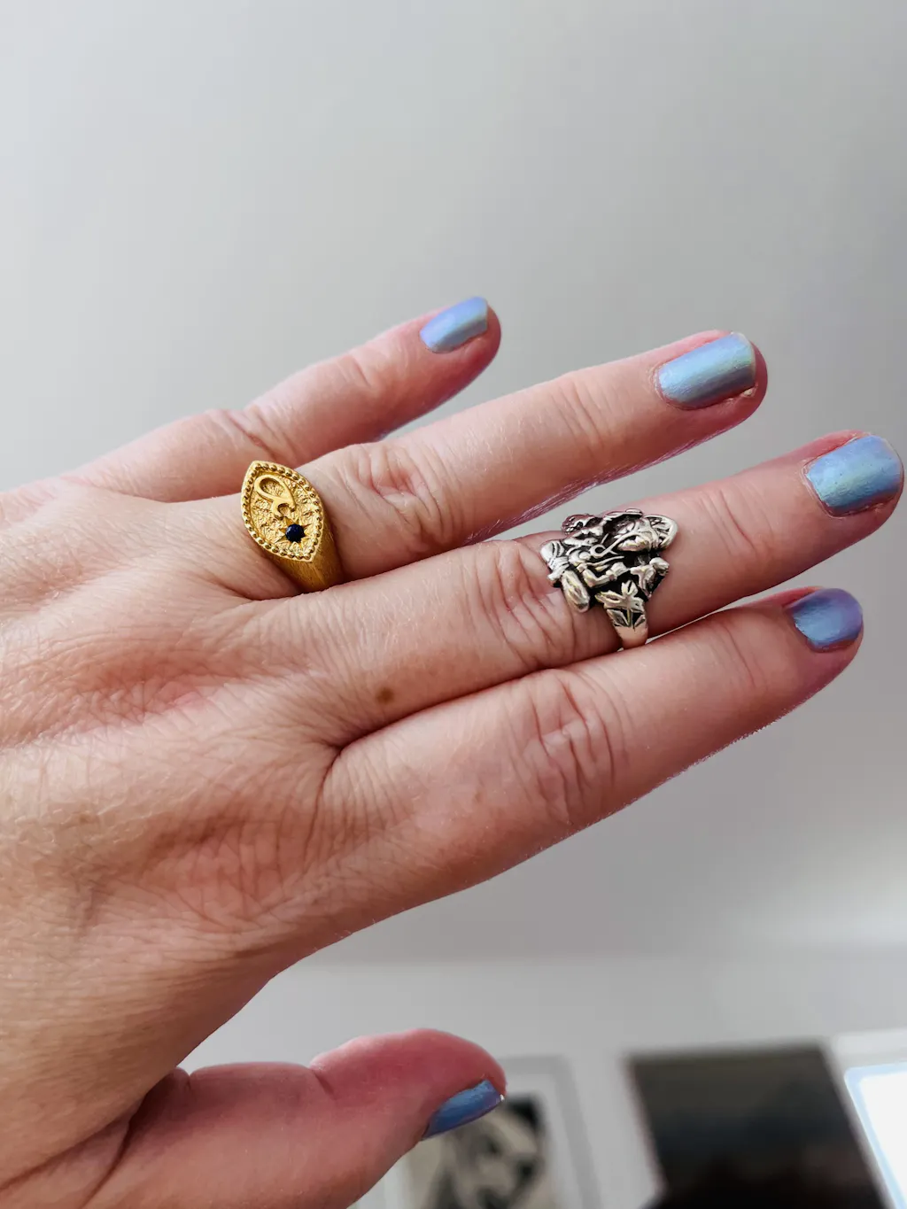 These stud earrings are an exciting new addition to Claire’s trademarked Shorthand collection, inspired by her time training as a journalist. The secret magic of language and the promise of deeper layers and hidden meanings felt perfect for a collection of personal talismans for powerful women.