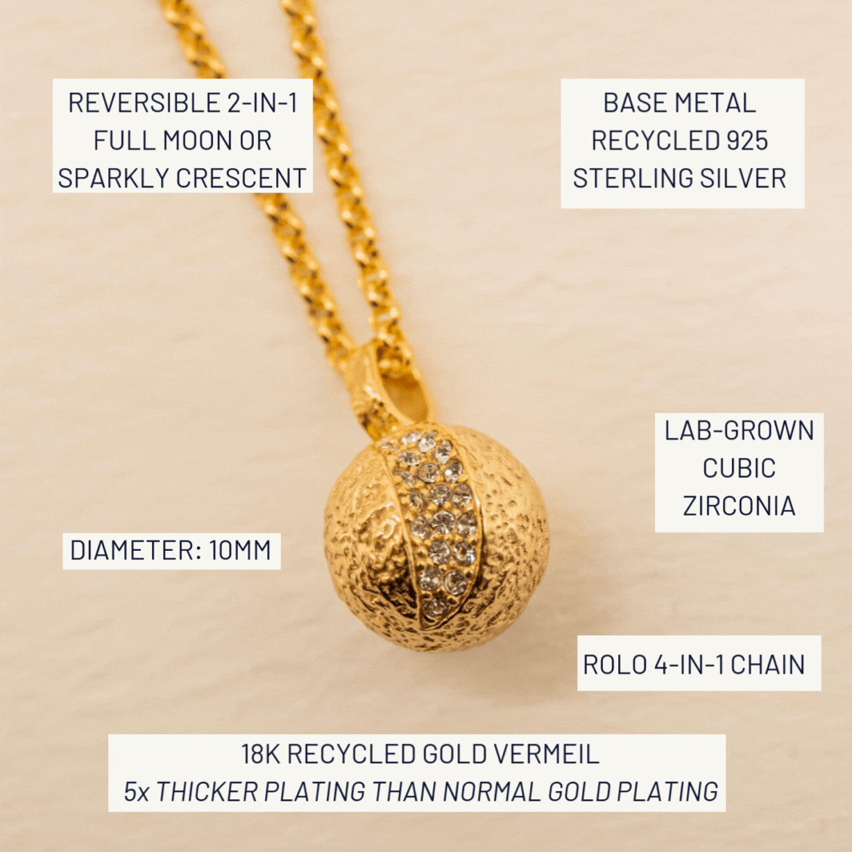 Add some magic of the night sky to your daily look with our striking reversible gold moon charm necklace. Wear the sparkly crescent moon or the full moon side to follow the lunar cycles or suit your mood. Made from sustainable 18k recycled gold vermeil for precious jewellery that feels good to wear.