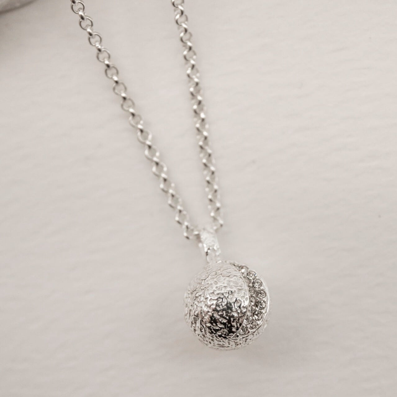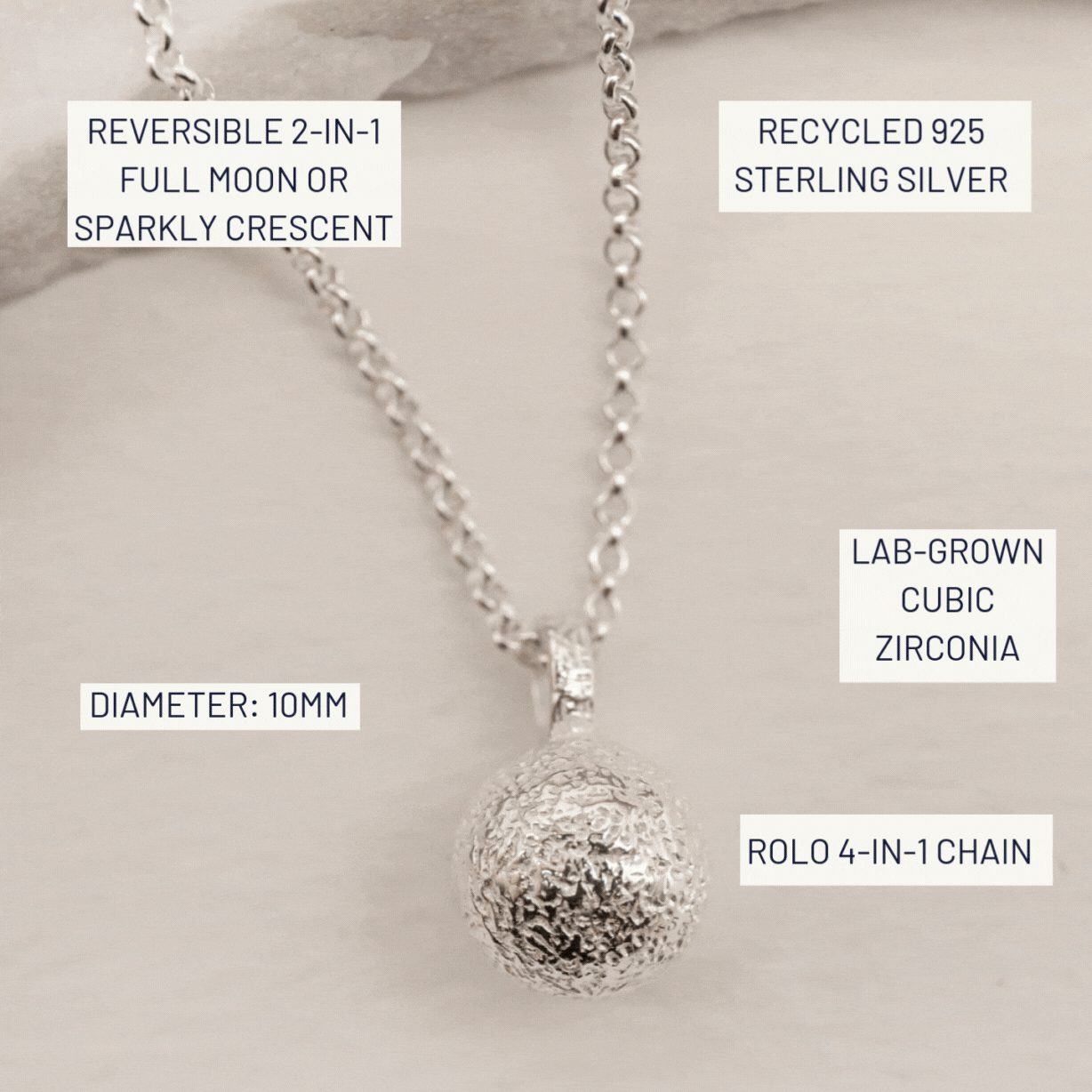 Handcrafted from recycled silver the textured pendant can be worn either the full moon side or the sparkly crescent.