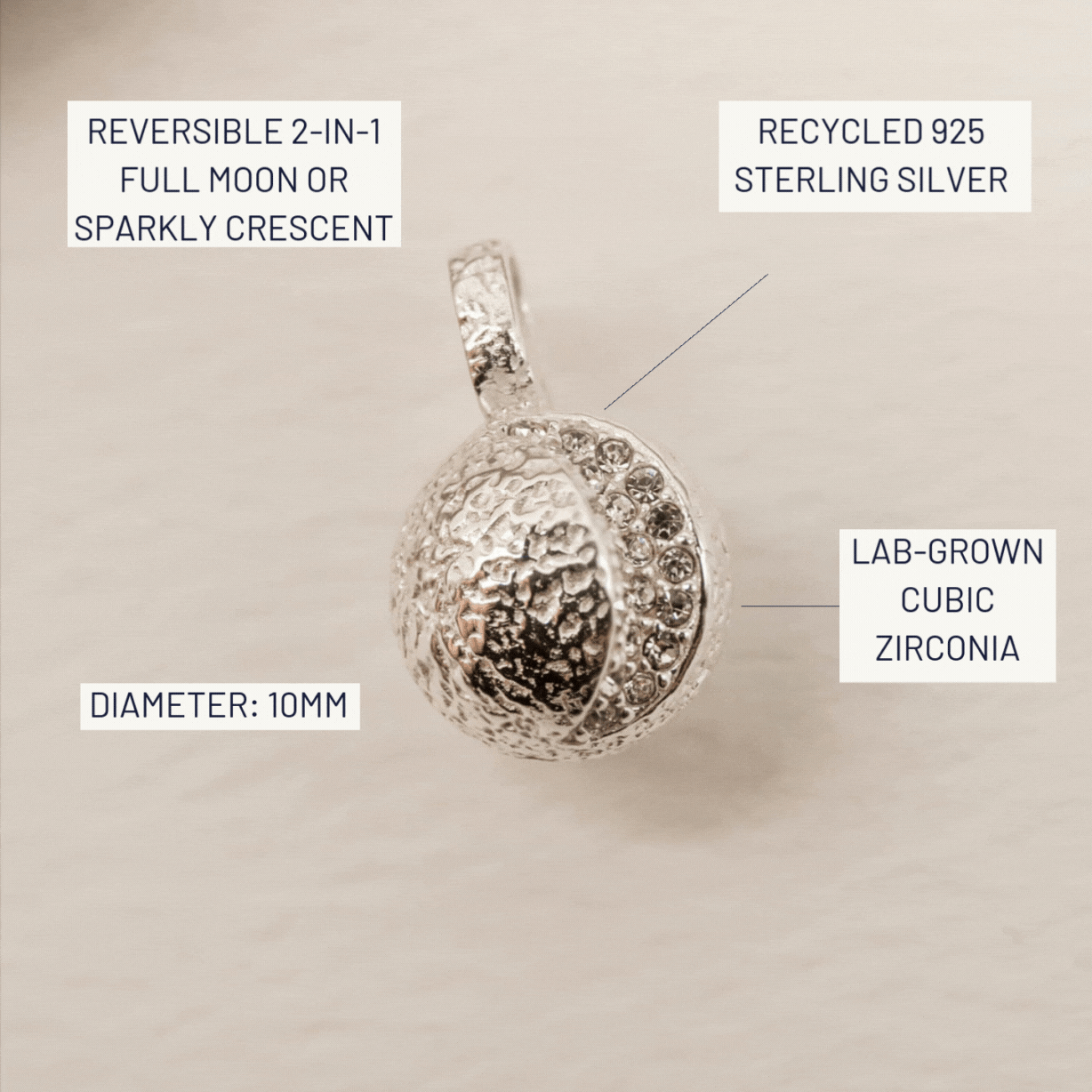 Channel the power of the galaxy with our textured reversible moon charm pendant. Handcrafted in recycled silver choose to wear the sparkly crescent side or the full moon one. Perfect for keeping in harmony with the feminine energy of the moon.