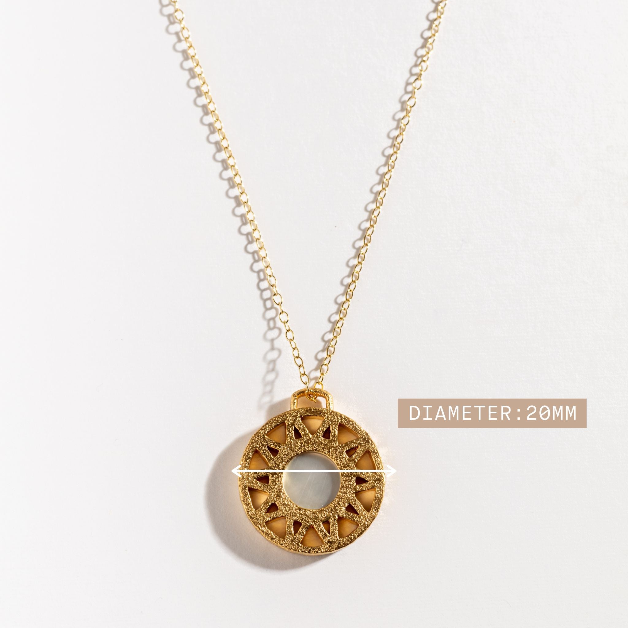 Sitting on a delicate chain this unique circular pendant features a distinctive inner circle of geometric triangles and an iridescent piece of Mother of Pearl in the centre, combining nature with the human endeavour.