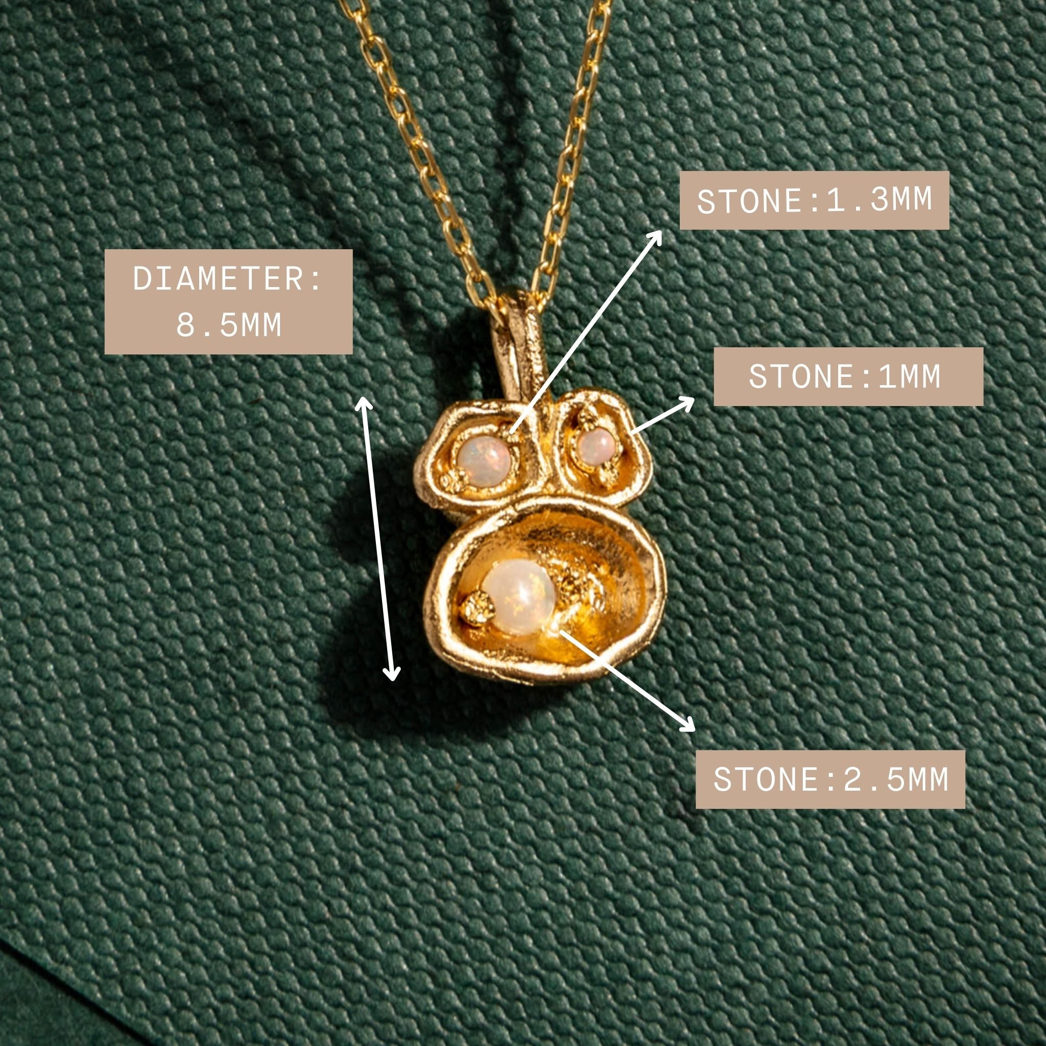 Inspired by escaping on woodland walks, the pretty opal gemstones sit like raindrops inside a gold vermeil pendant made from three organically shaped cup lichen.