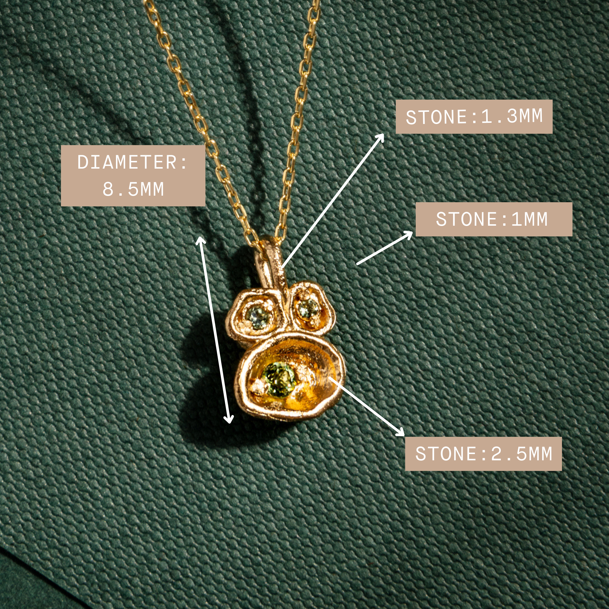 A dazzling semi-precious addition to your necklace collection it was inspired by one of nature’s most resilient and unusual creations, the lichen. These three organic lichen cups are filled with pale green peridot gemstones, like they have been dropped by the heavens. Associated with light and happiness and said to be linked to the birth of the solar system, these are powerful gemstones to have on your side.