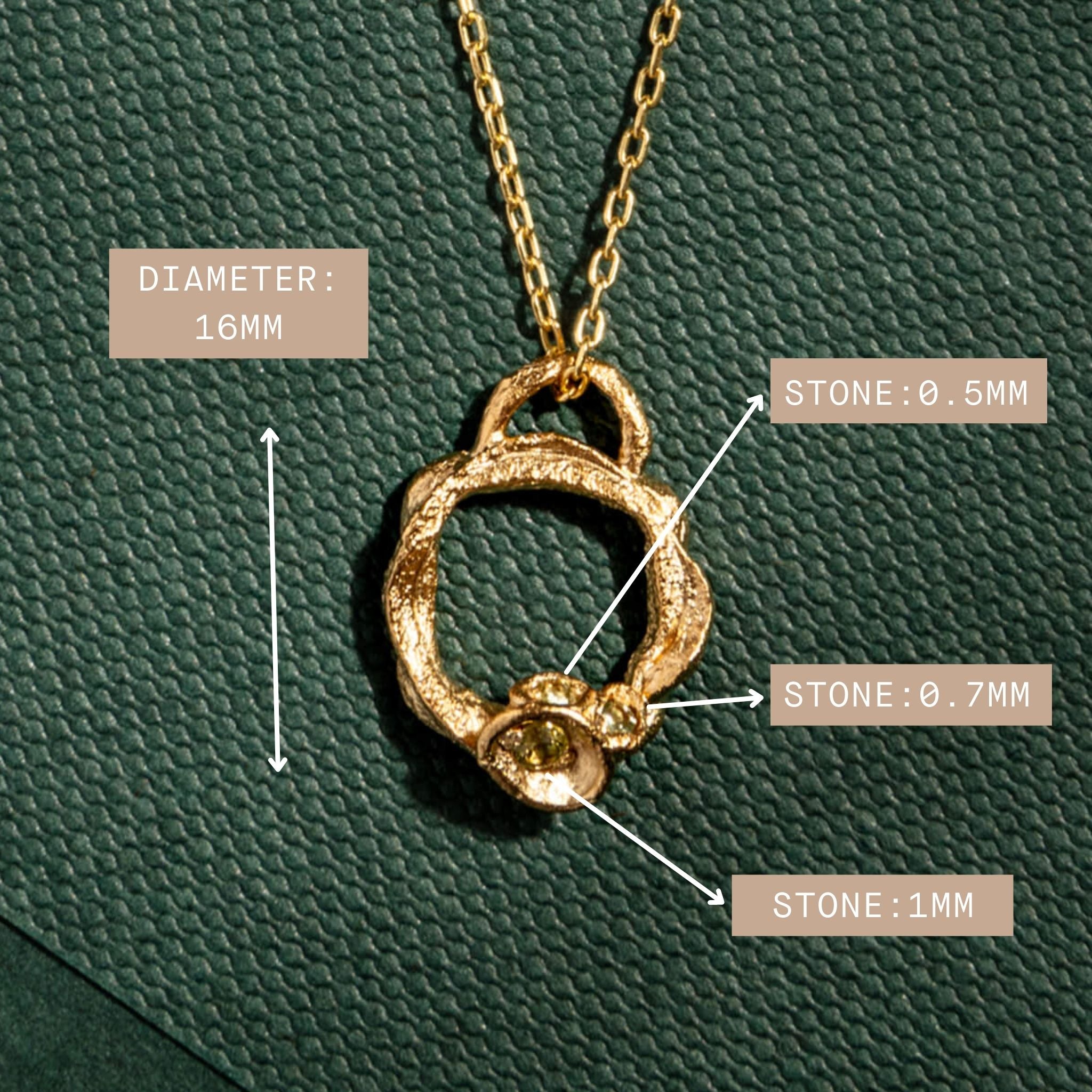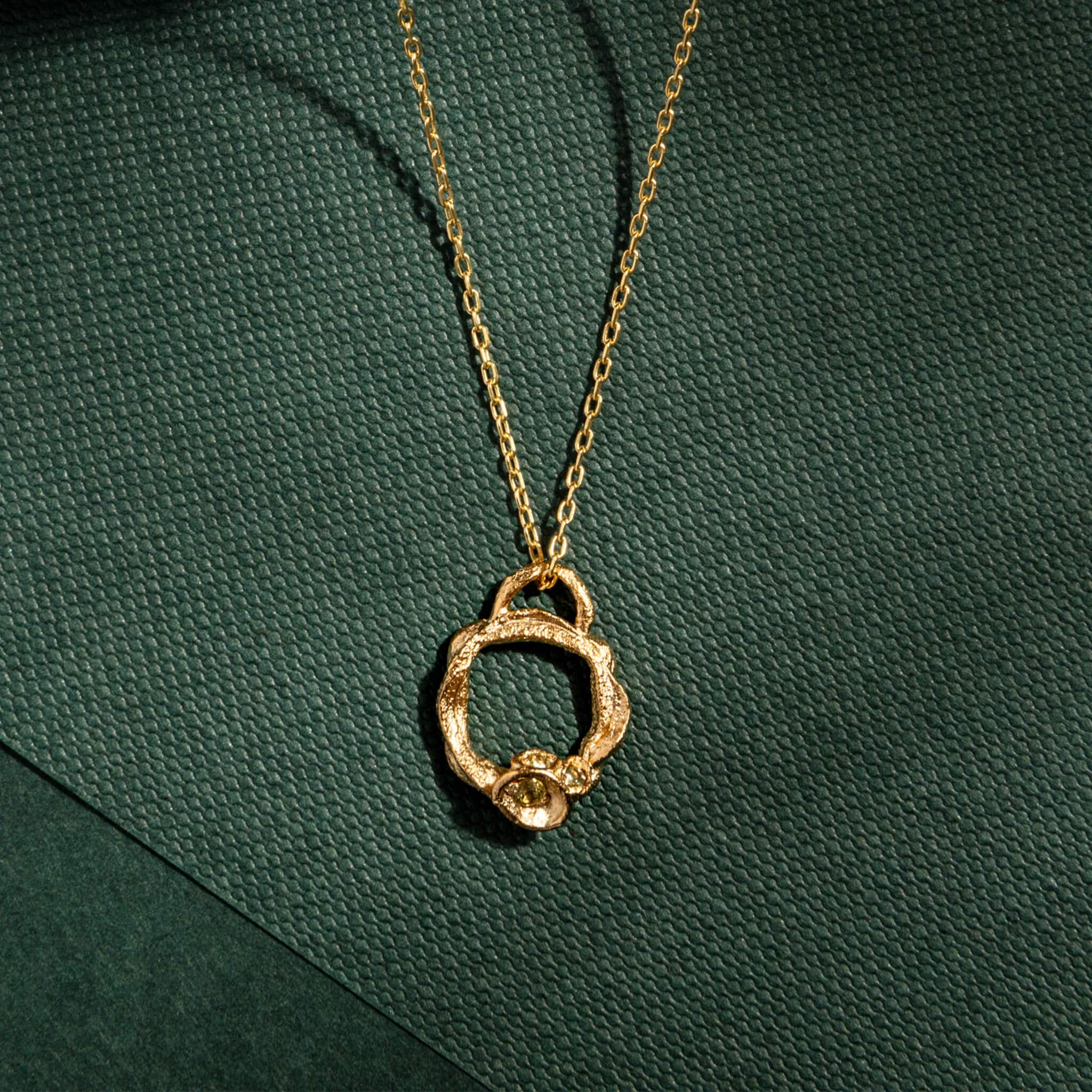 Set on an organic circular branch pendant, three lichen cups are filled with pale green peridot gemstones. The jewellery is inspired by woodland walks and the resilience of lichen, which thrives slowly but surely year after year.