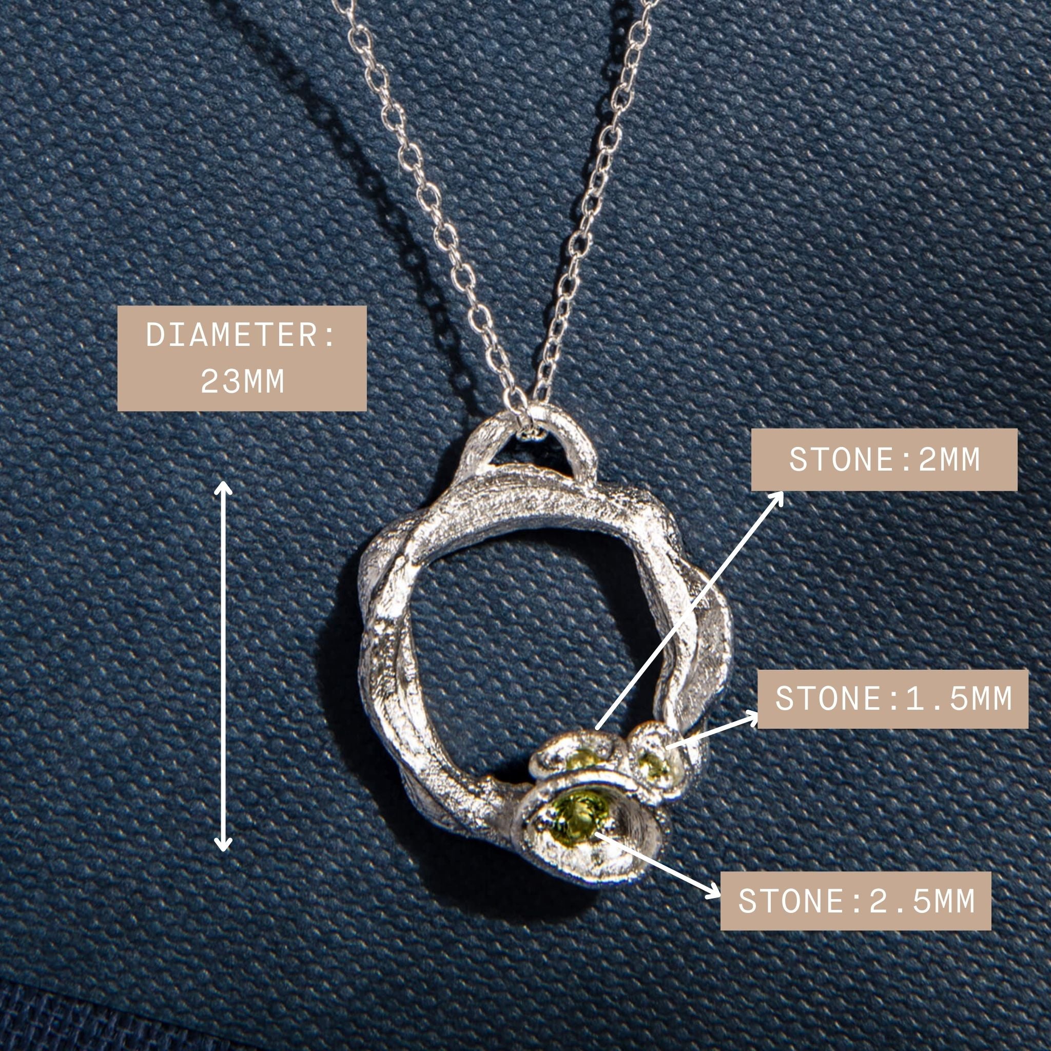 Said to be formed at the solar system's birth, three striking green perdiot gemstones sit like raindrops in the middle of the raised lichen design. One of nature's most stunning creations lichen represents resilience, and the dramatic silver circular branch symbolises eternity.