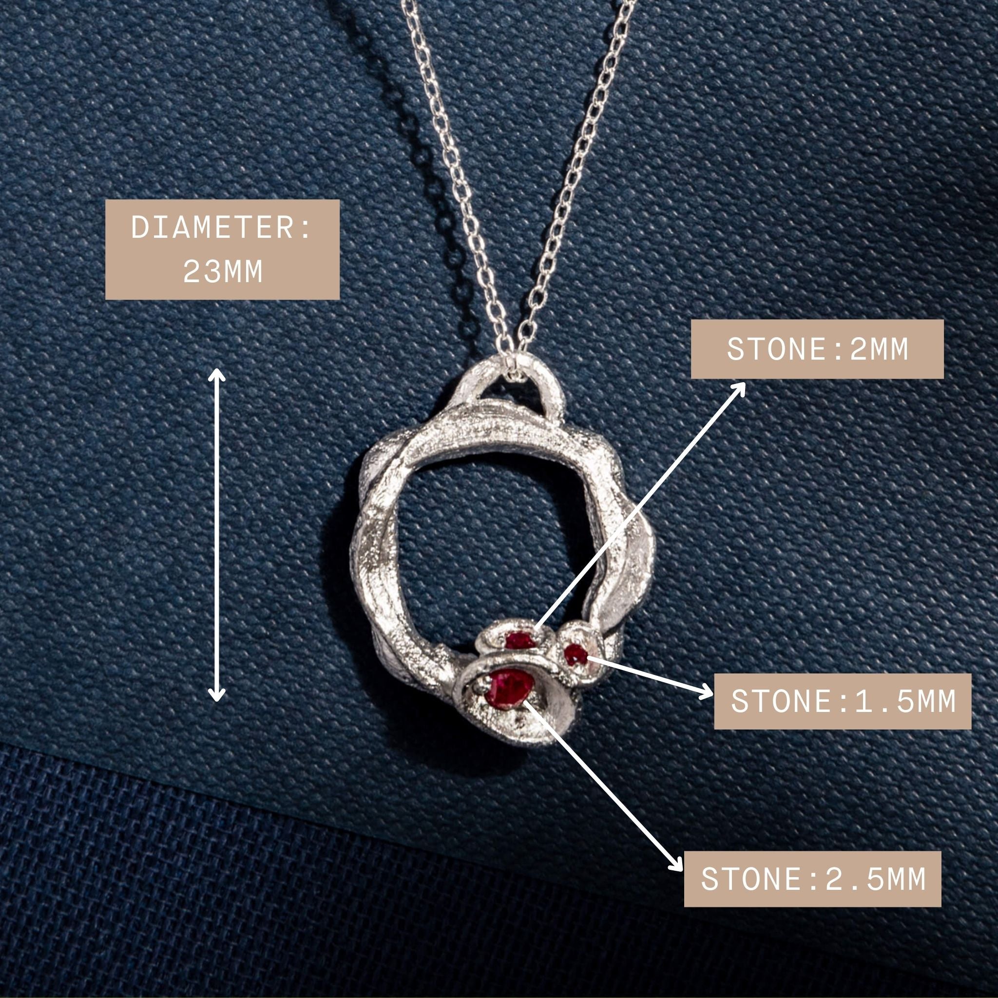 Dramatic and striking, this gemstone necklace not only looks great but is designed with hidden meanings to give you power and strength. The textured silver branch circle represents eternity; the cup lichen stands for resilience, and the three rubies symbolise the power of life.