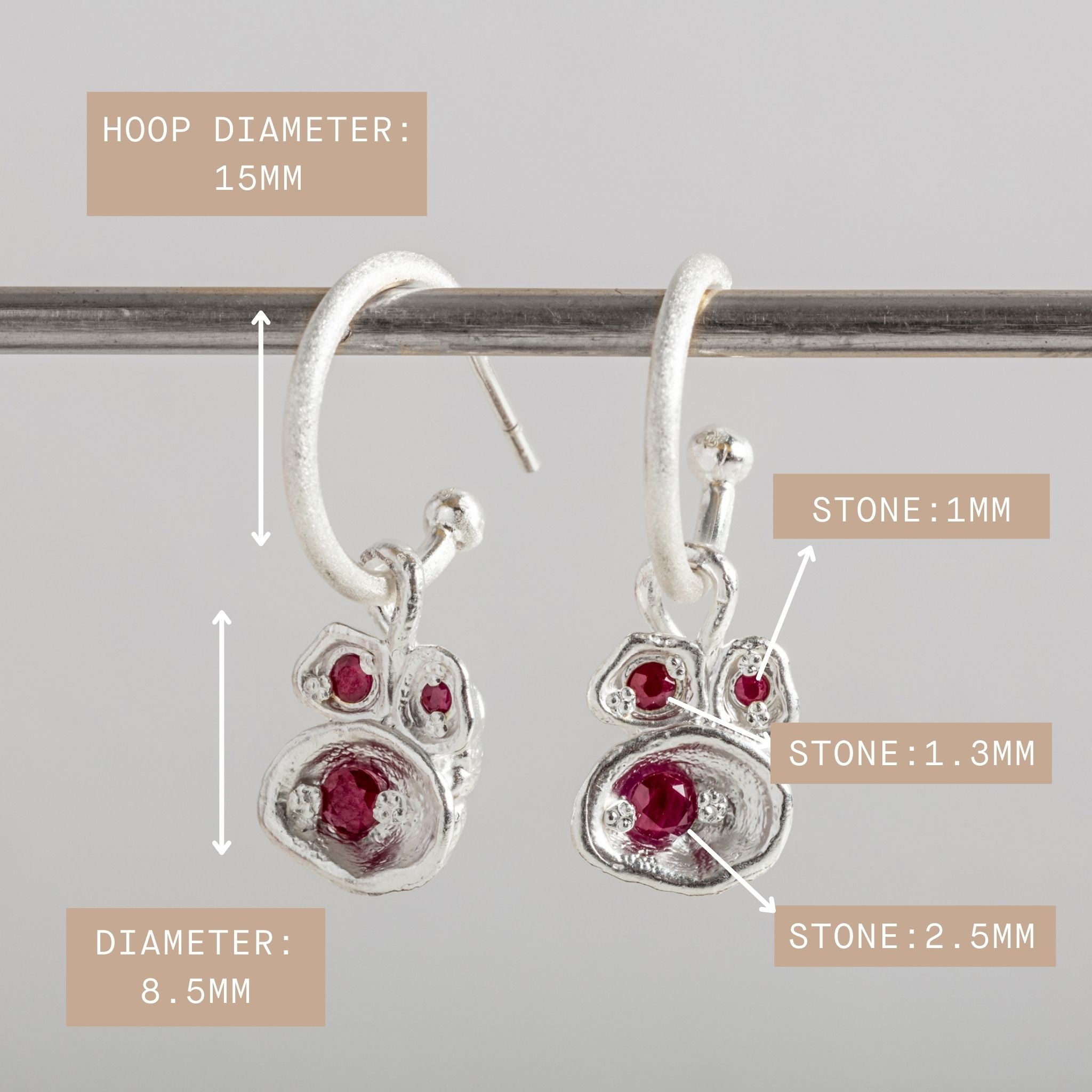 Gift something special with these dramatic ruby and silver statement hoops. Pairing luxury materials with unique design, stand out from the crowd in jewellery out of the ordinary. Symbolising passion and protection gift these precious gemstones with love.