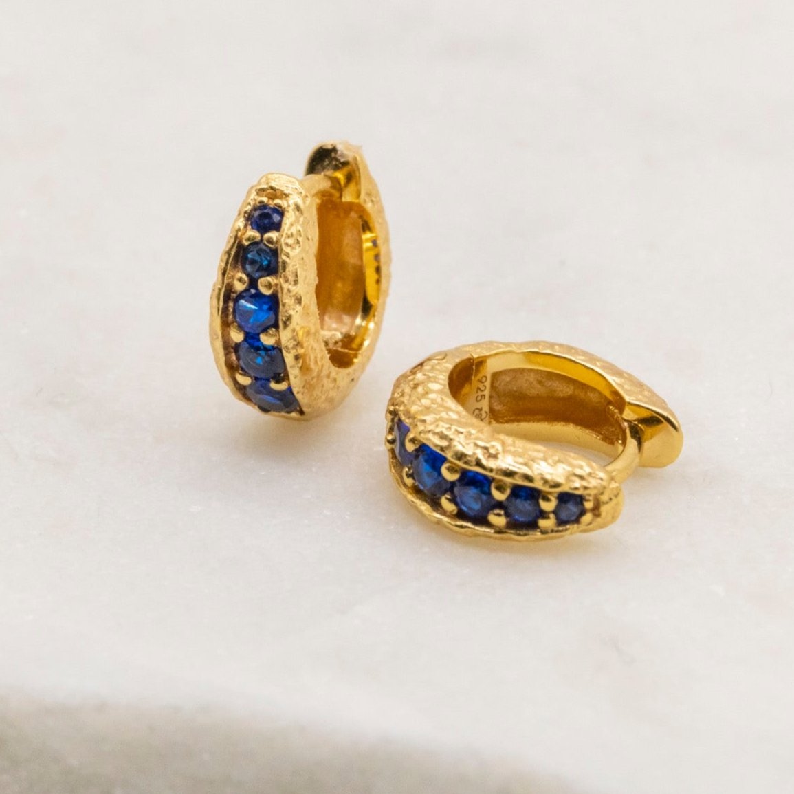 Upgrade your ear stack with these striking sapphire and antique textured gold huggie hoop earrings. Comfortably hugging your ears these mini 18k gold vermeil hoops are designed to make you stand out. Your ears deserve some TLC (Tactile, Luxury, Care).