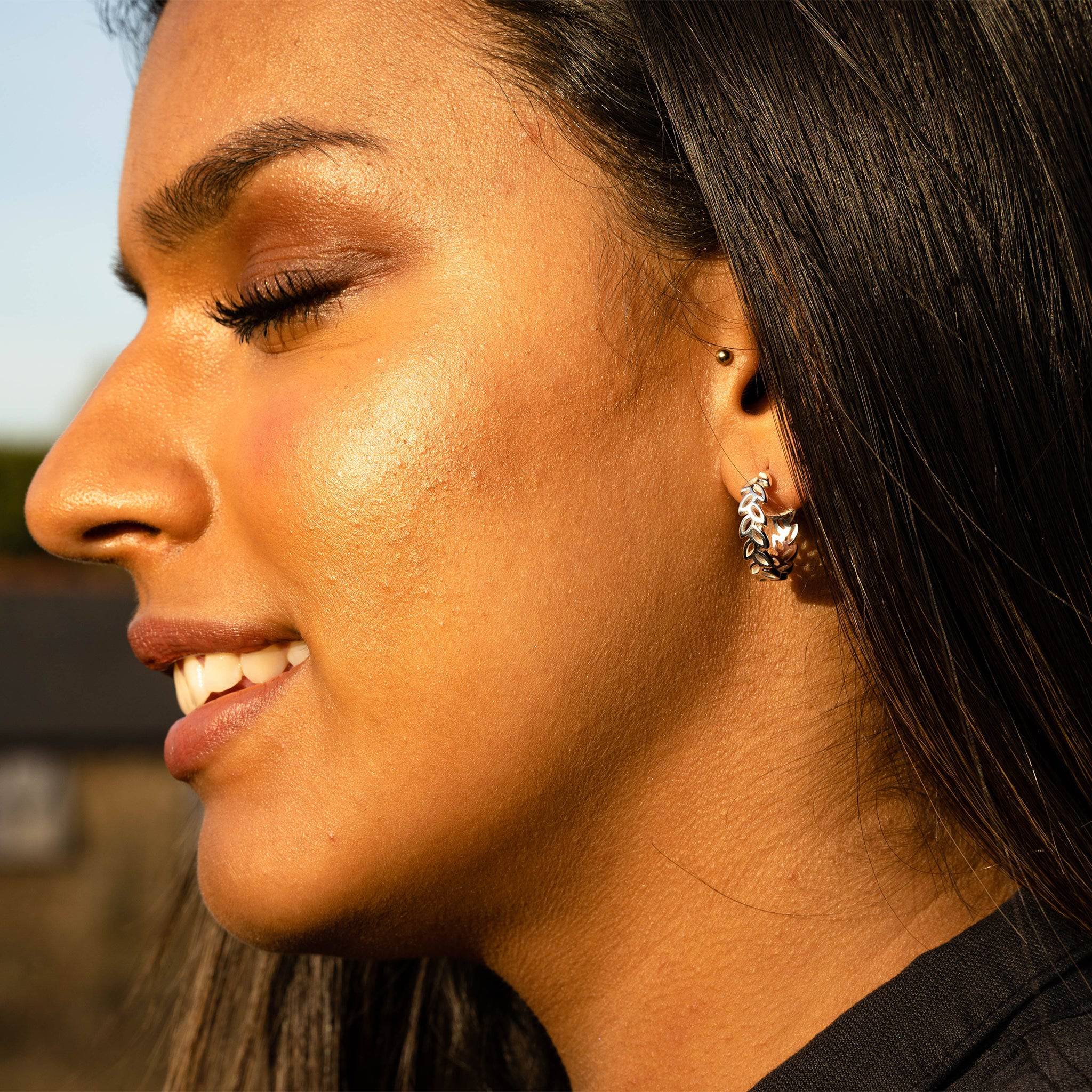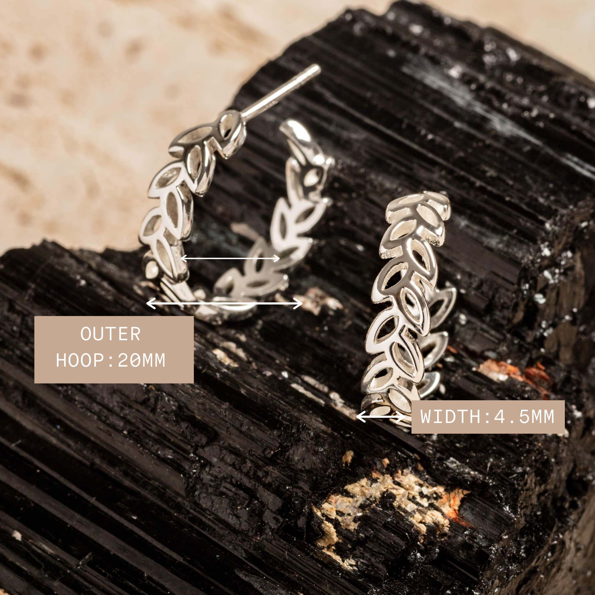 Take a piece of nature with you everyday with these pretty silver leaf hoops. The large 20mm hoop earrings are a versatile, luxe finish to any outfit.