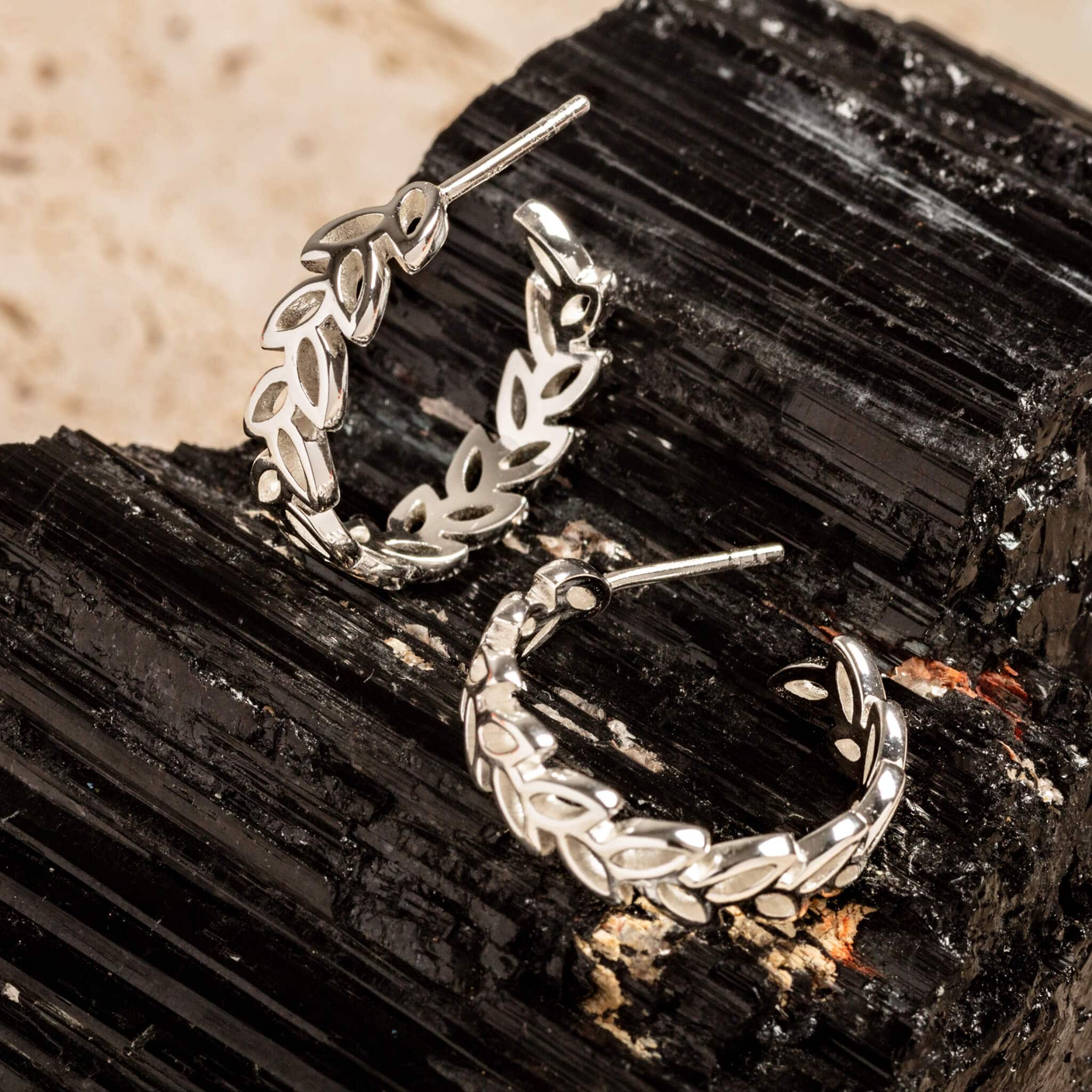Lightweight and easy-to-wear these striking hoops have a pretty cut-out leaf pattern. Made from 100% recycled silver these luxury earrings are made with the planet, and you, in mind.