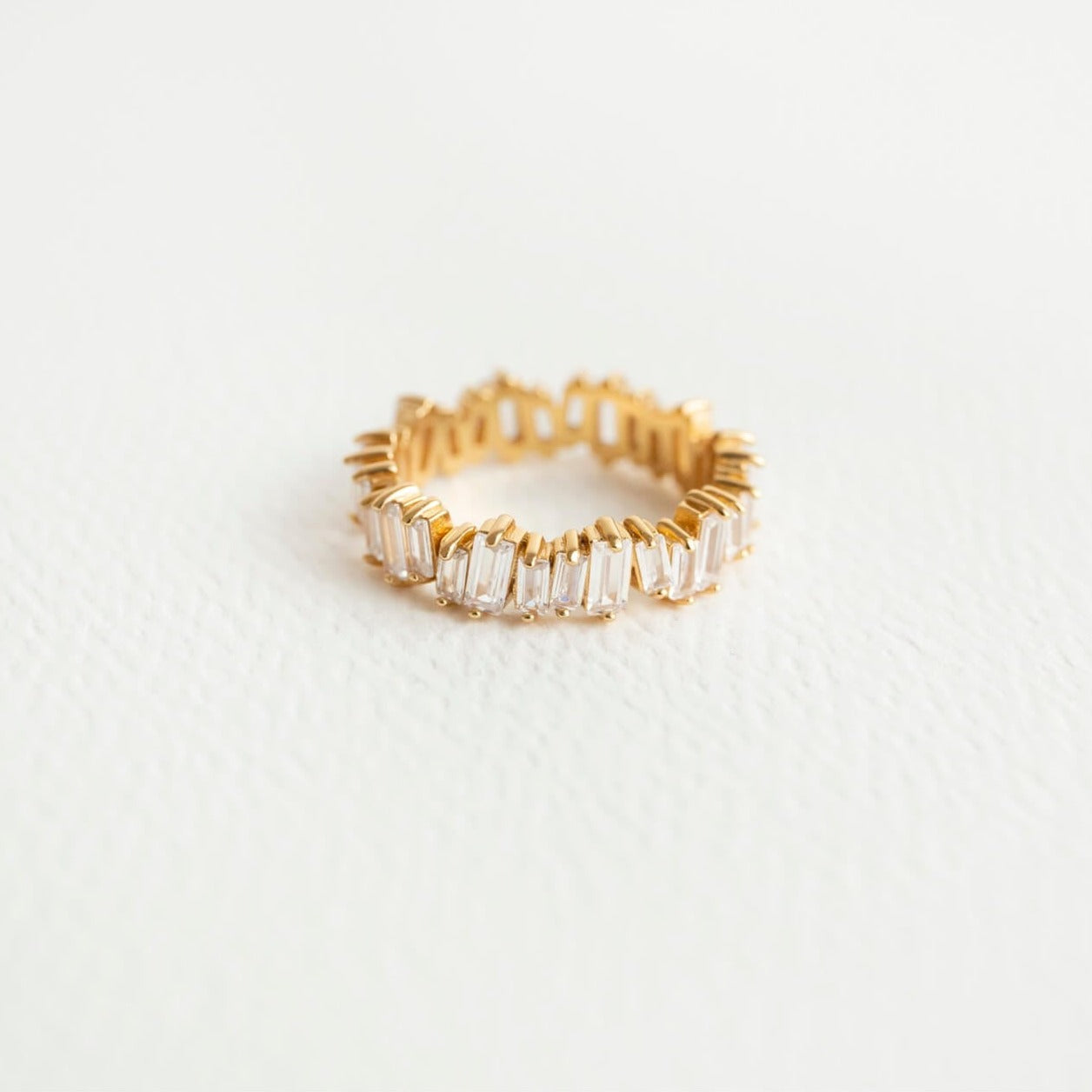 It’s time to dazzle. The perfect ring whatever the occasion, this eye-catching gold eternity ring will bring sparkle and shine to your life. Made with a mix of baguette and circle with lab-grown cubic zirconia set in a pattern that gives a unique shattered effect, this is a must-requested pairing to the best-selling Sparkly Baguette Hoop Earrings.