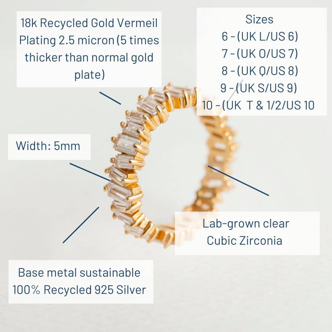 Both the silver and luxurious gold plating used in this ring is 100% recycled and the CZ stones are all grown in a lab, as we continue our promise to bring you stunning jewellery that does less harm to the planet.
