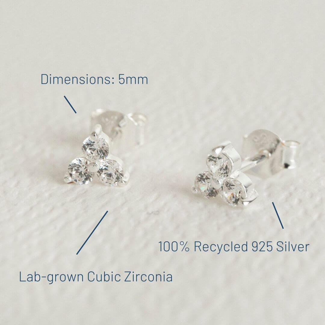 These subtle dainty studs glisten and glimmer when they catch the light. Add some highlight to your natural glow with the floral trio of cubic zirconia stones set in recycled silver.