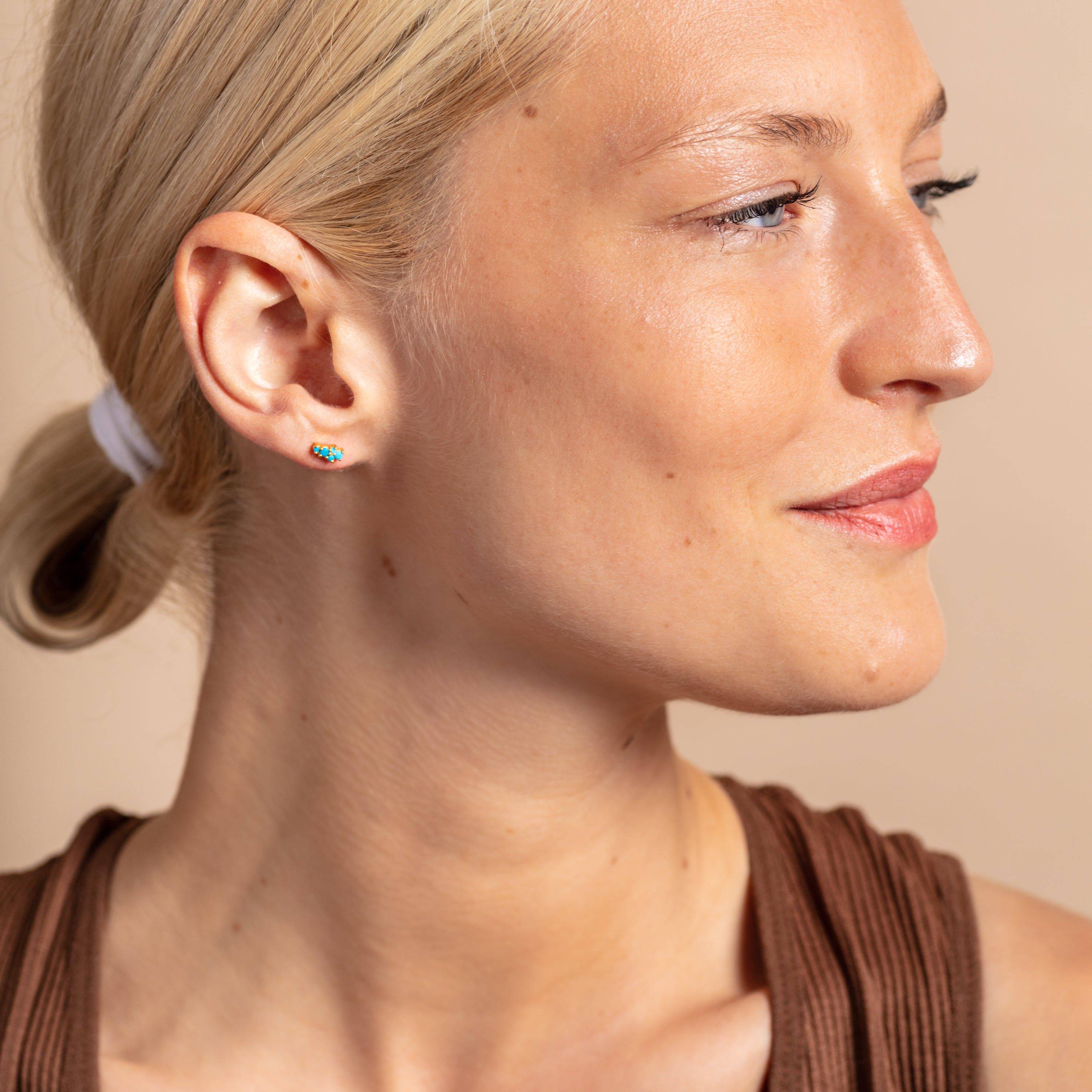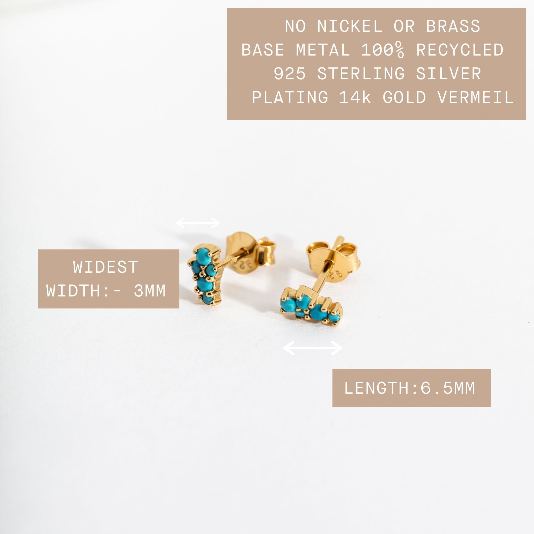 If you are looking for small but eye-catching studs you can call off the search. Scattered with turquoise cubic zirconia stones and sitting in premium long-lasting 14k gold vermeil these unusual stud earrings are out of the ordinary.