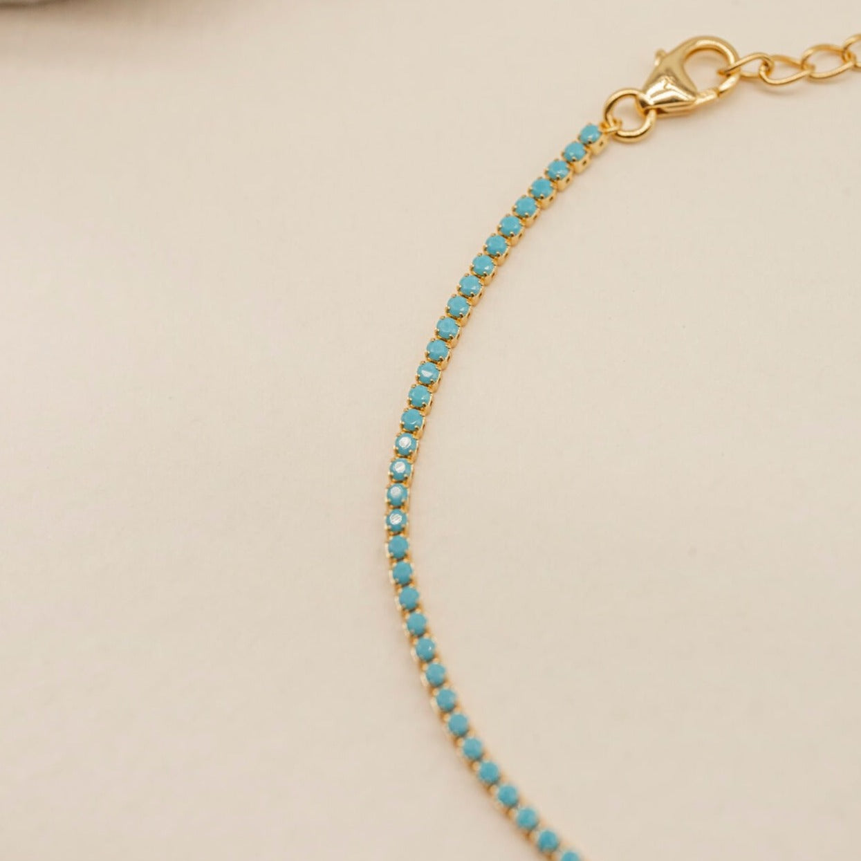 This dazzling tennis bracelet is finished with vibrant turquoise cubic zirconia stones which pop against the rich gold vermeil.