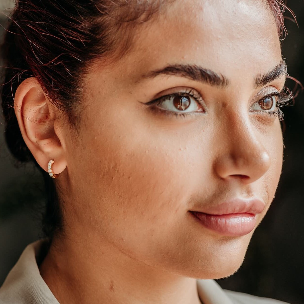 A dreamy pair of hoops perfect for any ear stack. Shining white opals take centre stage with these striking gold vermeil huggie earrings. You'll feel put together in seconds in these small but striking earrings.