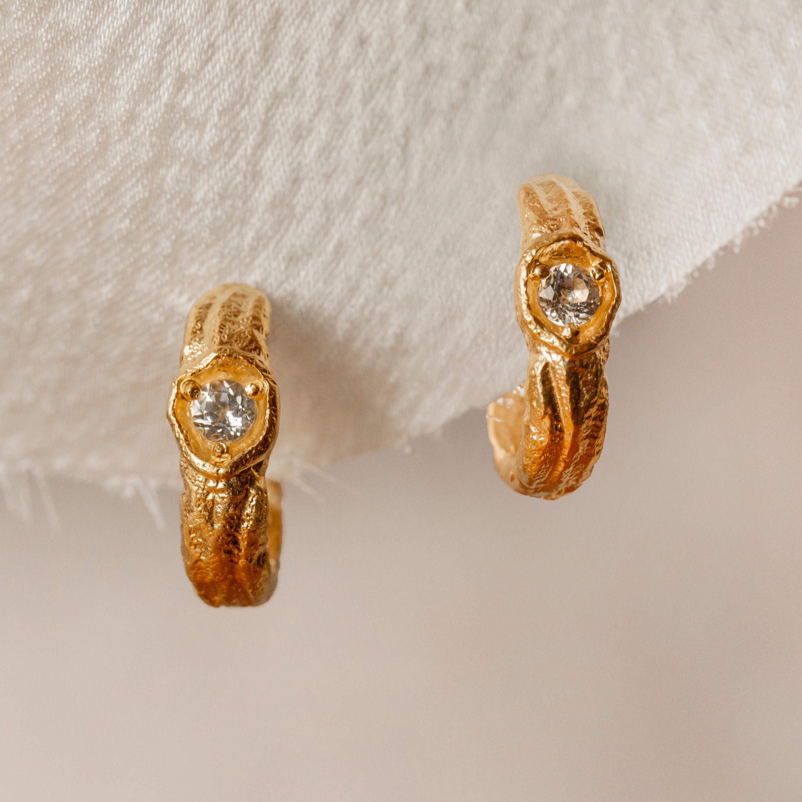 Designed to dazzle these tactile white topaz gemstone hoop earrings are finished with a rich, warm 14k gold vermeil gold finish for effortless luxury.