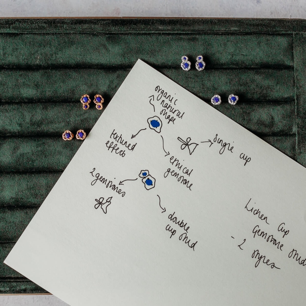 Inspired by woodland walks and an extension of the popular birthstone collection these earrings feature two cup lichen. This beautiful living organism is a pioneer species, often the first thing to grow. It grows slowly, step by step, each year and is a reminder of the resilience of our world.